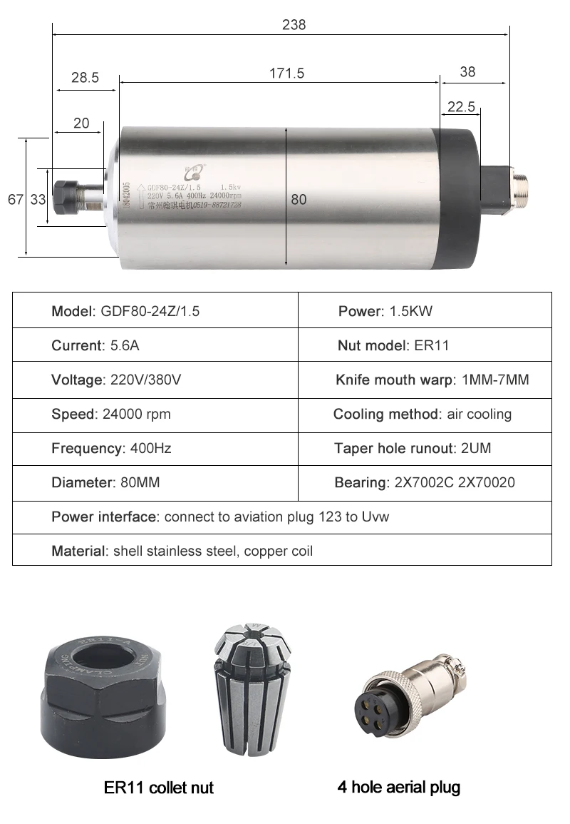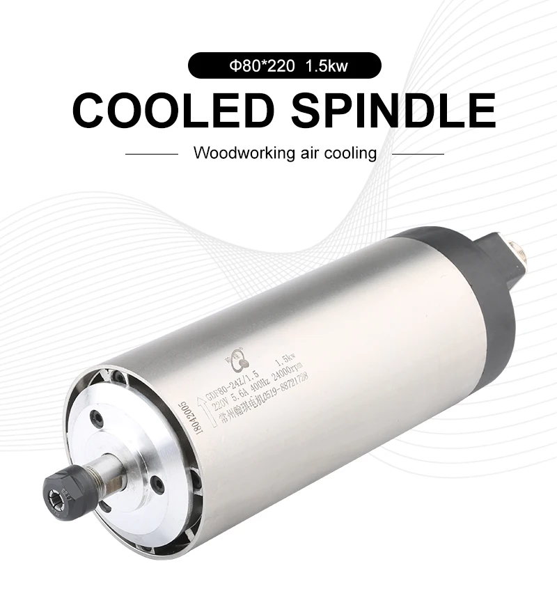 Размер: 80x238 мм круглый режим регулирования скорости с воздушным охлаждением: можно изменить скорость вращения шпинделя через трехфазный выходной инвертор, настроить частоту инвертора. Метод охлаждения: охлаждение ветром, Мощность интерфейс: дополнительно 4 pin водонепроницаемый воздушный штекер. К инвертеру подключаются газовые вилки «1», «2», «3», «4», «1», «2» и «3» (U, V, W) и 4 подключены к инвертору. Заземление оборудования. Мощность: 1. КВт, 5 кВт, Напряжение: 220v 380 В Ток: 5.6A частота: 0-400 Гц Скорость: 0-24000 об/мин Jumping: менее 0,01 мм Диаметр (мм):80 мм 4 Полностью герметичные Угловые контактные подшипники патрон: ER11 диаметр приспособления: 10 мм, 9 мм, 8 мм, 7 мм, 6,35 мм, 6 мм, 5 мм, 4 мм, 3,175 мм, 3 мм, 2,5 мм, 2 мм, 1,5 мм, 1 мм (стандарт 6 мм) смазка с водяным охлаждением ER11 ER16 патрон Основные применения: для дерева, бамбука, обычной печатной платы, ПВХ, ПММА, пластика, бамбука, ABS и другие неметаллические резьбы.