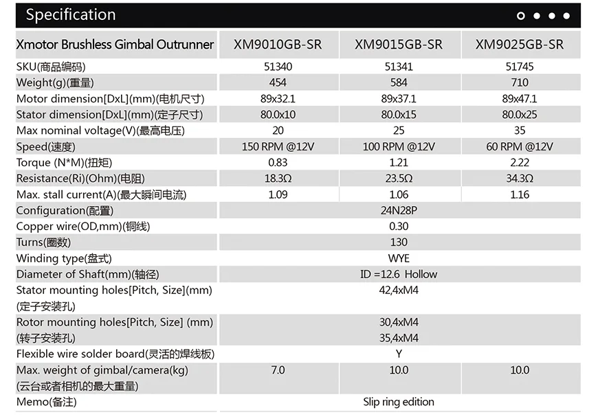 XM9010GB-SR 9015GB-9025GB-SR brushless motor with slip ring