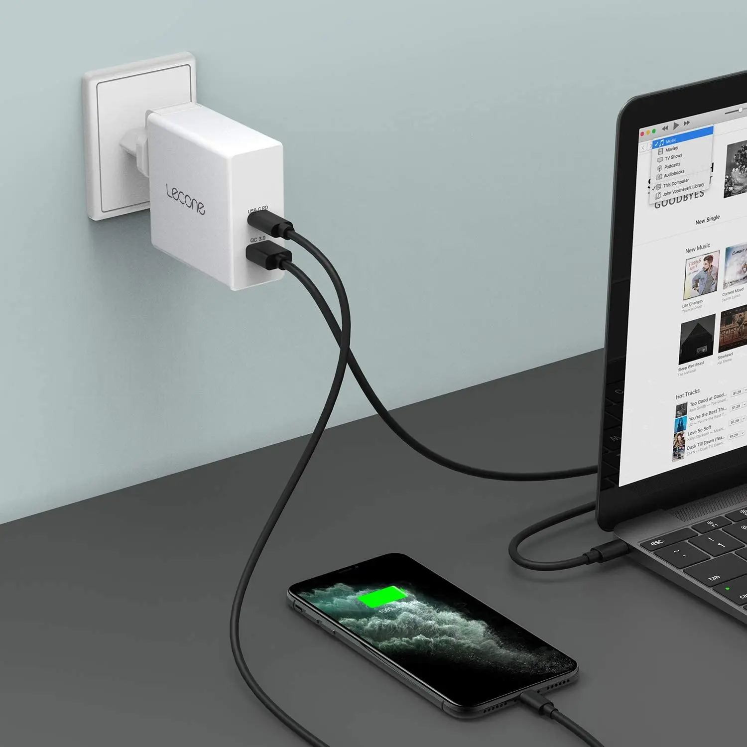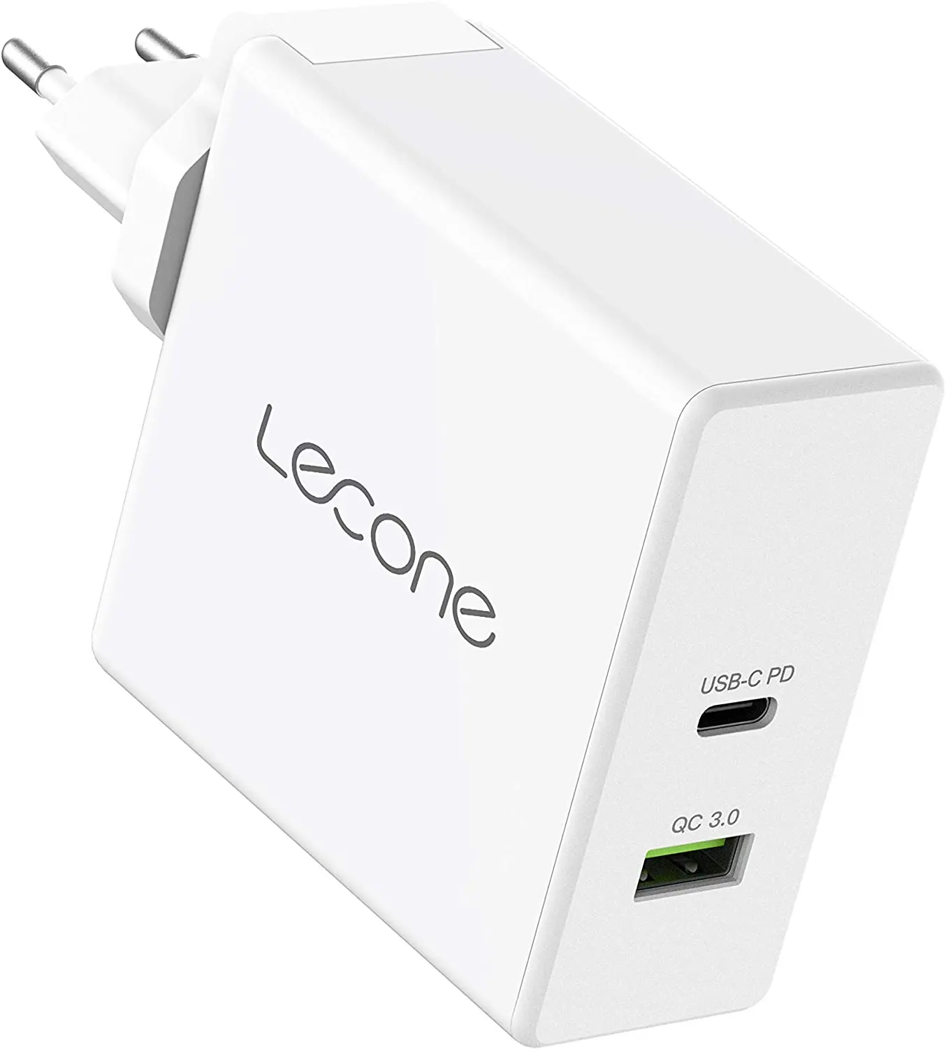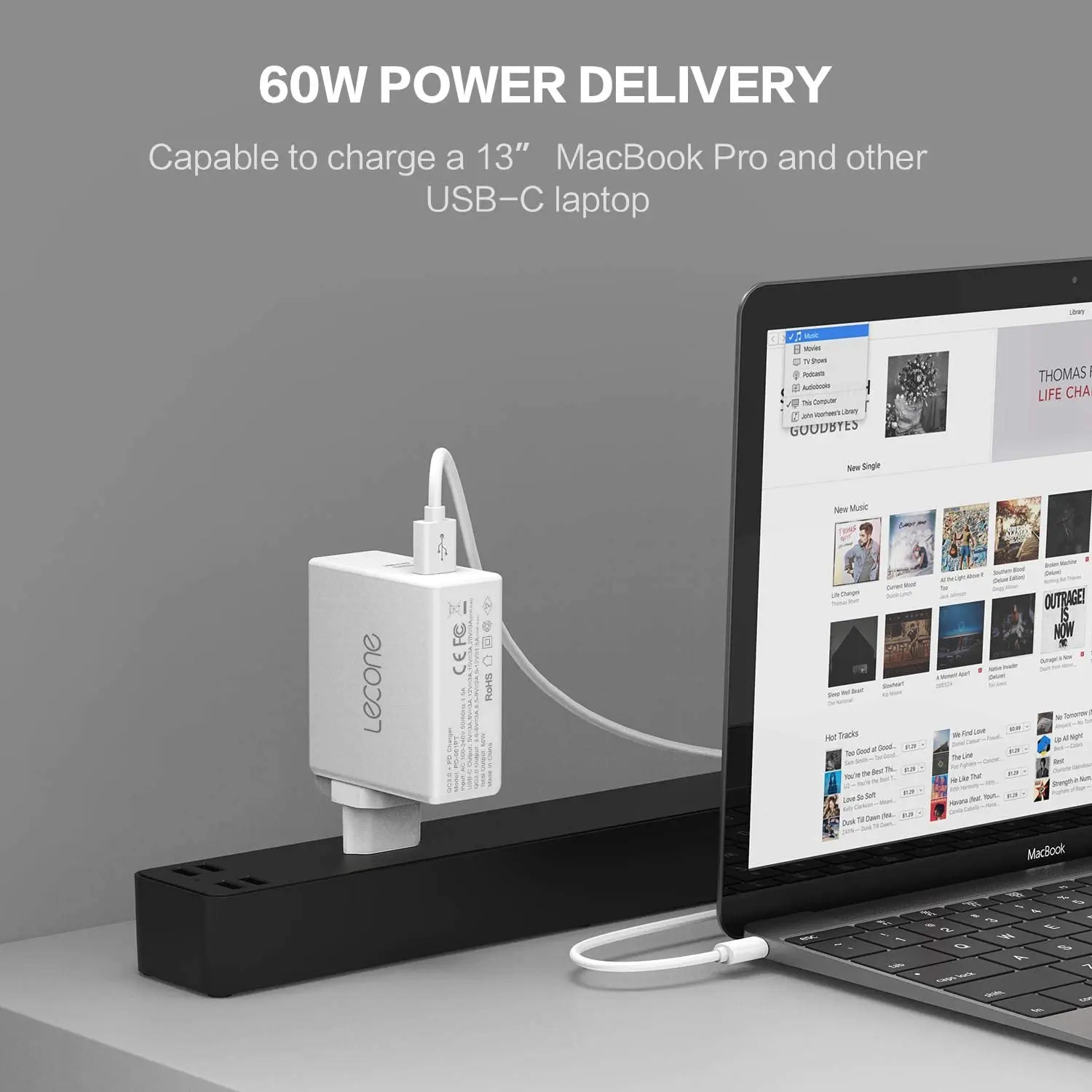 Тонкий и компактный:Зарядное устройство USB 60-W с двумя разъемами Lecone измеряет 74x69x31 мм и меньше, чем адаптер переменного тока для MacBook 61W USB-C. Кроме того, зарядное устройство имеет два подключения, которые вы можете заряжать ноутбук и смартфон одновременно с полной скоростью зарядки.