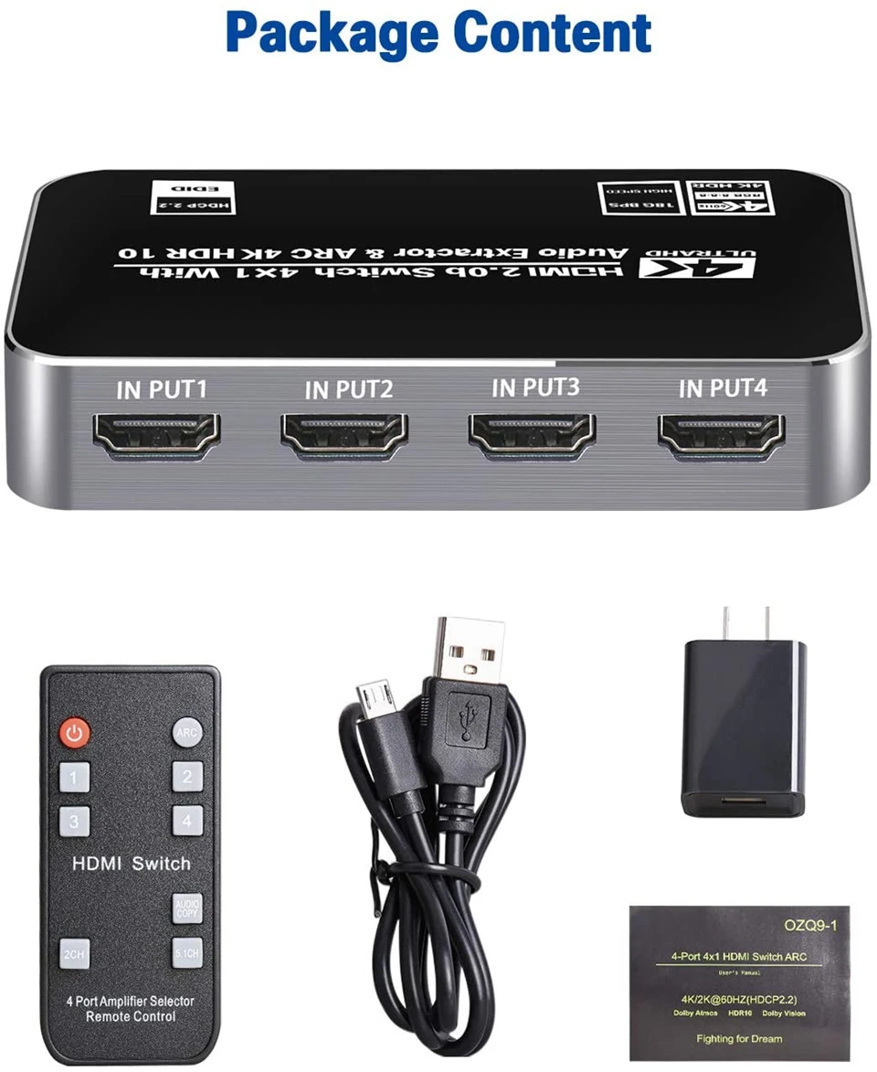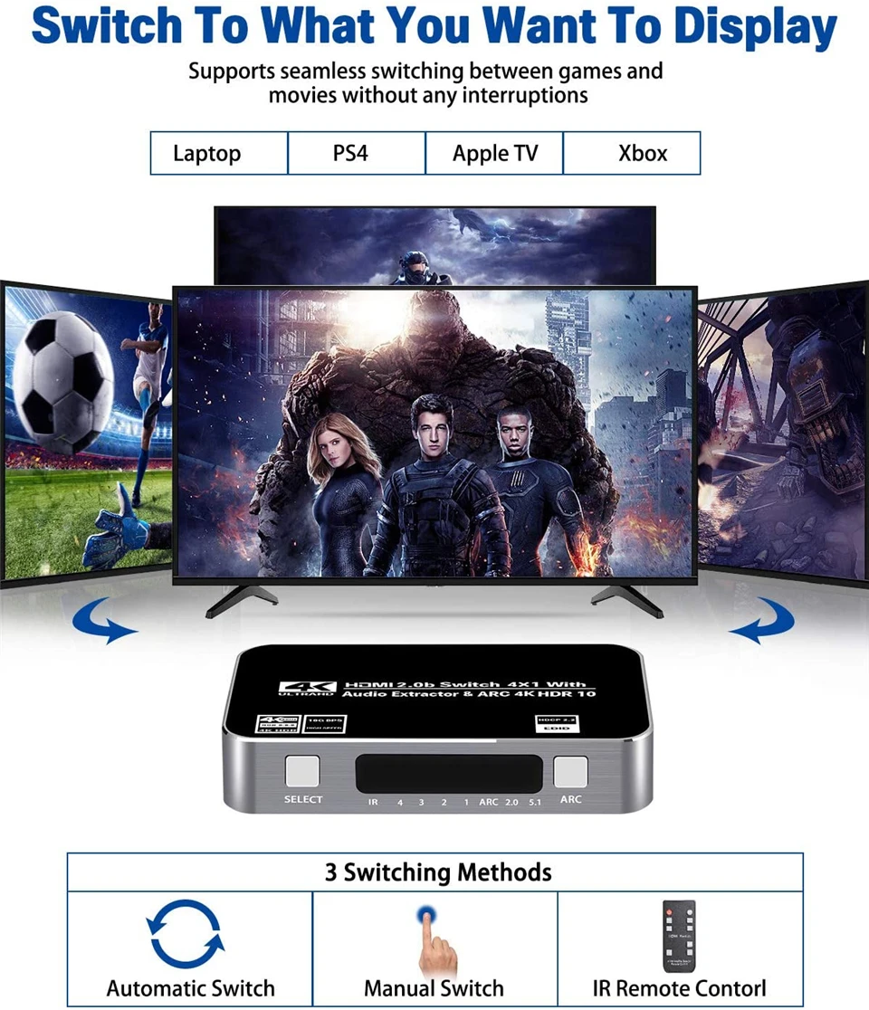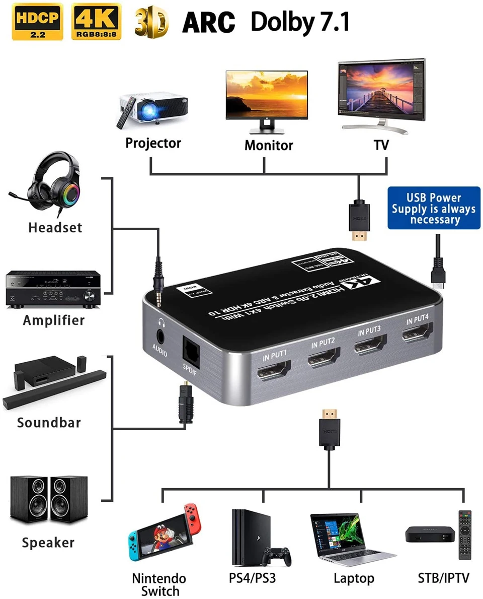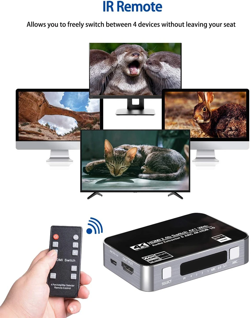 · HDMI ARC адаптер: HDMI2.0 селектор Switcher 4x1 поддерживает ARC (Канал возврата аудио), извлекает аудио из телевизора в Саундбар или усилитель. Подключите ваш ТВ HDMI (ARC) порт к этому переключателю HDMI выходной порт с HDMI кабелем, затем с помощью оптического Toslink, коаксиального, 3,5 мм или L/R кабеля подключите к саундбару, динамику, домашний кинотеатр, приемники A/V и т. Д. Нет искажений аудио или видео. Все аудио порты поддерживают ARC.