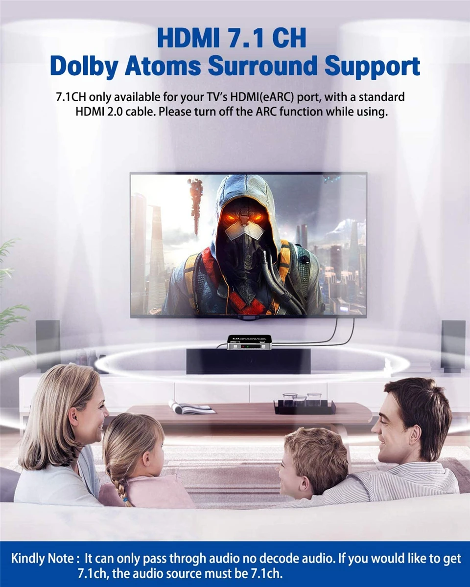 · Три режима переключения аудио: (режим передачи, 2CH и 5.1CH) 3,5 мм аудио выход поддерживает входящее 2CH PCM LPCM стерео аудио; Оптический SPDIF выход поддерживает входящее 2CH PCM, 5.1CH Dobly Digital, 5,1 цифровой объемный, Dobly TrueHD, DTS-HD. (Примечание: Этот hdmi-аудио коммутатор не может декодировать только через аудио форматы.)