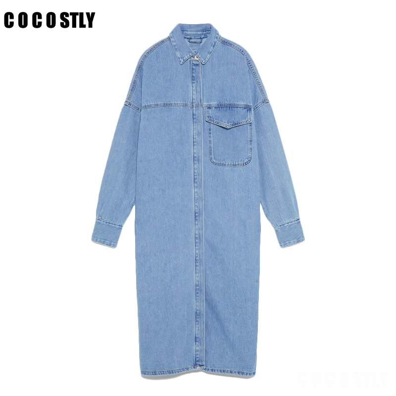 Новинка 2021, осенние женские винтажные синие длинные джинсовые куртки, однотонные джинсовые пальто с карманами, женская верхняя одежда, повседневная свободная ковбойская ветровка