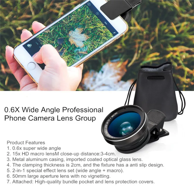 1. 0.6x супер широкий угол, давая вам 120 градусов супер широкое поле зрения. 0.45x широкий угол, давая вам 110 градусов супер широкое поле зрения. (Примечание: Пожалуйста, обратите внимание на ваш выбор) 2. 15x макрообъектив высокой четкости с близким расстоянием 3-4 см. 3. Металлический алюминиевый корпус, импортные линзы из оптического стекла с покрытием 4. Толщина зажима составляет 2 см, а крепление имеет противоскользящий дизайн. 5. 2-в-1 со специальным эффектом объектива Набор (широкоугольный + макро).6. Объектив с большой диафрагмой 50 мм без виньеттинга. 7. Прилагается: высококачественный карман и защита объектива 8. Профессиональный эффект.