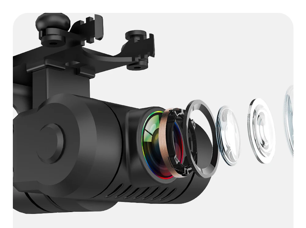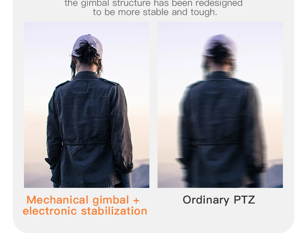 Two-axis mechanical stabilization gimbal: Enhanced mechanical stabilization gimbal can better eliminate camera shake and jitter, and improve camera image quality. In addition, the gimbal structure has been redesigned to be more stable and tough.