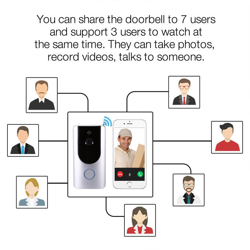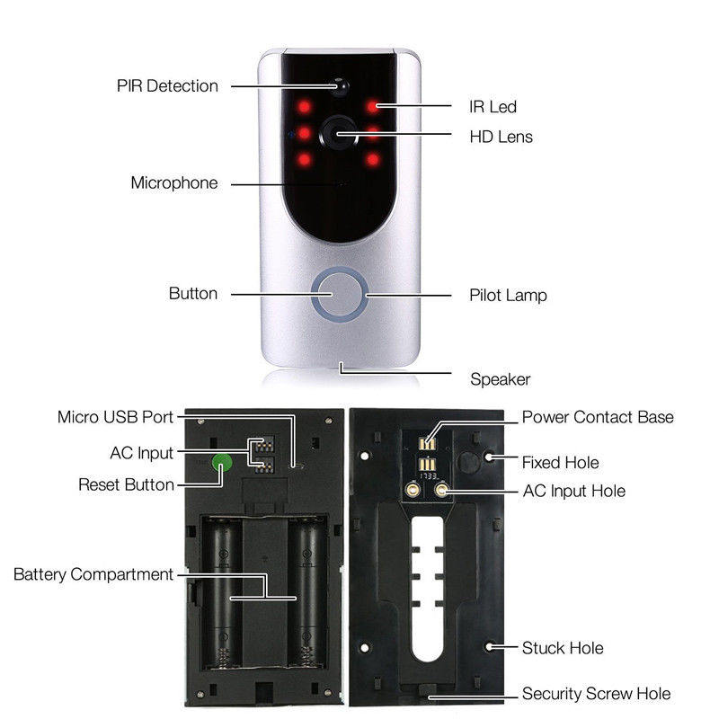 Описание: -Название: беспроводной видеодомофон -Особенности: беспроводное соединение, сверхнизкое энергопотребление, дистанционное активное пробуждение, быстрый старт -Использование: Гости могут посещать для видеои аудиозвонков, а короткое видео, владелец может знать информацию, не открывая дверь -Режим будильника: кнопка дверного звонка просыпается, PIR-датчик обнаруживает и просыпается, а мобильный телефон просыпается -Сигнал тревоги: Быстрое нажатие в течение 1 секунды -Решения с низким энергопотреблением: решение с низким энергопотреблением HiSilicon -Онлайн-пользователи: несколько пользователей смотрят онлайн одновременно -Динамическое доменное имя: поставляется с динамическим доменным именем Характеристики: * Основной чип управления: Hi3518Ev200 * Датчик изображения: 1/3 CMOS * Видео: -H.264 -Адаптивная адаптация скорости к различным сетевым средам -Двунаправленный речевой диалог с самостоятельным эхоподавлением * Голос: Встроенный громкоговоритель/Встроенный микрофон * Угол обзора: 166 * Дневная и Ночная функция: -Автоматическое переключение IR-CUT двойного фильтра -Инфракрасная лампа 6 светодиодный 850 мм -Светочувствительность 1 люкс * Подключение: -Wi-Fi 2,4 ГГц, IEEE 802.11b/G/N -Радиовещание -Сканировать QR-код * Хранение: поддержка SD-карты 8G/16G/32G/64G (карта в комплект не входит) * Режим пробуждения: кнопка дверного звонка пробуждается, PIR человеческое тело обнаруживает и пробуждает, мобильный телефон пробуждается * Сигнал тревоги: Быстрое нажатие в течение 1 секунды * Скриншот: скриншот мобильный телефон в реальном времени * Активное Пробуждение: мобильный телефон удаленное активное пробуждение, пассивное Пробуждение и Пробуждение клавиатуры устройства * Push-уведомления: Быстрое нажатие в 1 с * Аккумулятор: 2*18650/3.7V, 3400mAH, перезаряжаемый (5V AC зарядка) (не входит в комплект) * Отходы питания: рабочий ток 170мА, ток в режиме ожидания 160uA