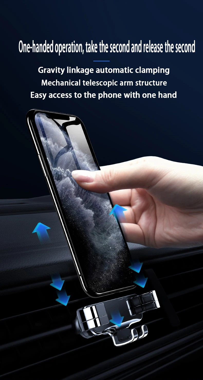 Дизайн: инновационный дизайн, гравитационная связь и треугольная поддержка, автоматически зажимается, когда телефон надевается на держатель, устойчивый и стабильный, отпустите автоматически, когда снимите телефон с держателя, легко и удобно. Прочная и хорошо Защитная: Высококачественная резка из алюминиевого сплава, поверхностное окисление, Для крепления на автомобиле используется эластичный и противоскользящий зажим, плотно удерживающий вентиляционное отверстие, мягкие резинки на вентиляционном отверстии, чтобы не царапать устройства.