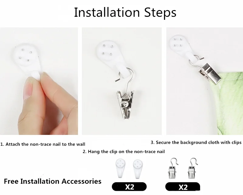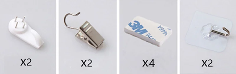Аксессуары: 2 * гвоздь без маркировки + 2 * зажим + 2 * крючок + 2 * двухсторонняя наклейка