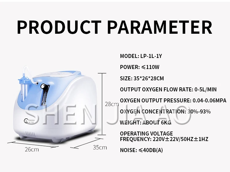 Модель: LP-1L-1Y мощность: ≤ 110 Вт Размер: 35*26*28 см выходной расход кислорода: 0-5 л/мин Выходное давление кислорода: 0,04-30% МПа концентрация кислорода: 93%-Вес: около 6 кг частота рабочего напряжения: 220 ± 22 в/50 Гц ± 1 Гц шум: ≤ 40 дБ (A)