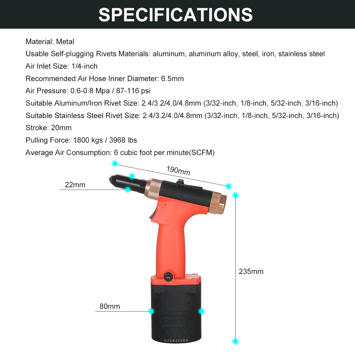Мощный воздушный Клепальщик-обеспечивает сильную тяговую силу до 1763 фунтов, постоянно приводит нержавеющую сталь/алюминий/железо заклепки без помех, и требует воздушного давления между 87 и 116 psi, гладкая и легкая в использовании.