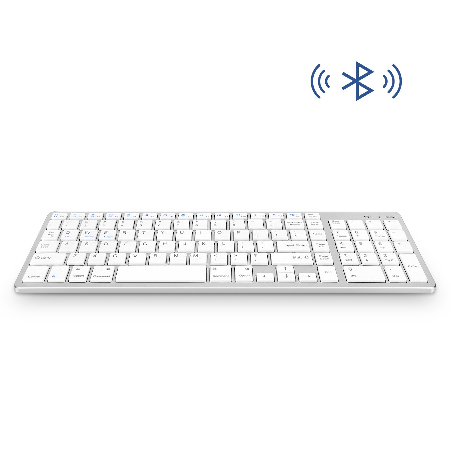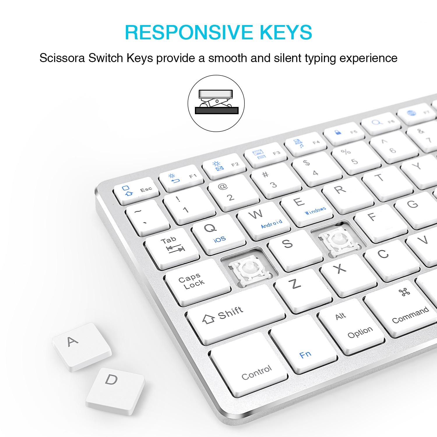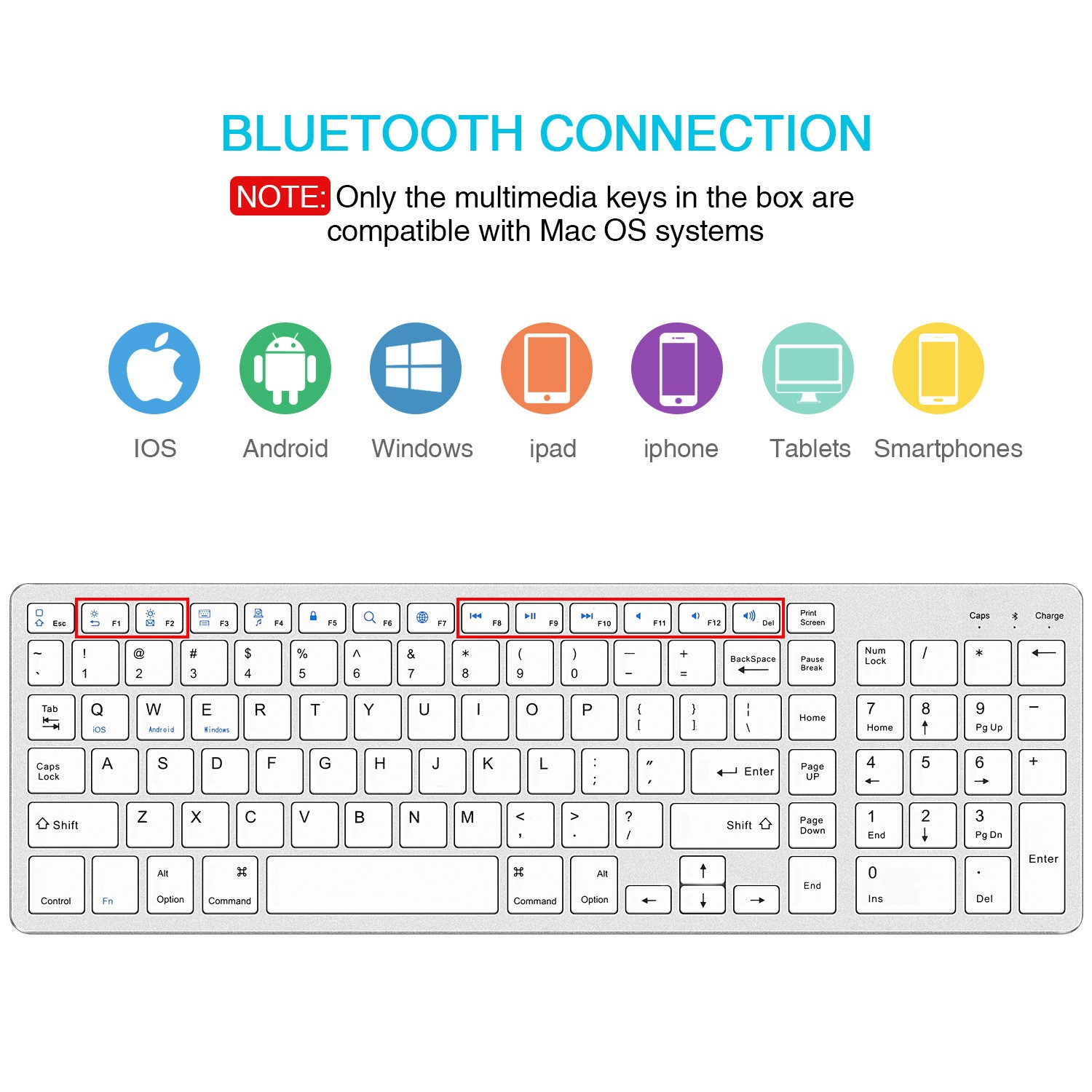 Ярлыки и Противоскользящий дизайн: с помощью полезных клавиш требуется только один нажатие клавиш Для управления приложением, которое может повысить эффективность вашей работы. В Клавиатура bluetooth хорошо захватывает стол и не перемещается с помощью Резиновая подкладка внизу. Примечание: мультимедийные клавиши не полностью совместимы С системой OS