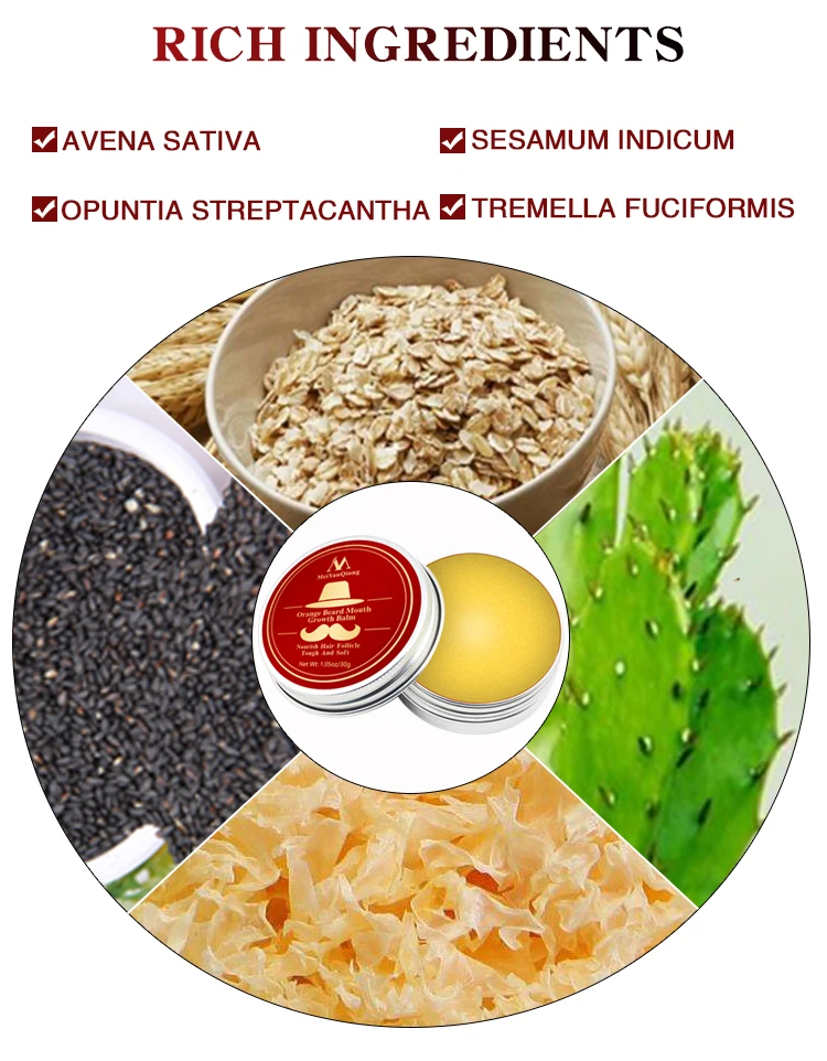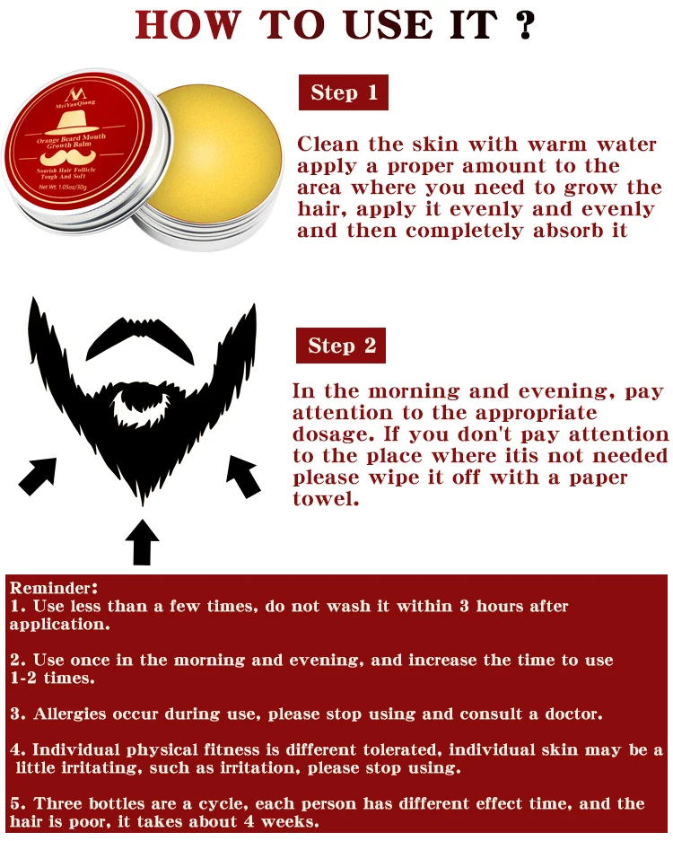 Name :Orange Beard Mouth Growth Balm Net wt:1.05oz/ 30g Features:Rich in natural botanical ingredients it promotes the growth of whiskers while moisturizing and smoothing preventing bifurcation and sheddingmaking it thick and reinforced effectively preventing itching and dryness ,making the beard shiny and sleek, and emitting different Scope:Beard scarce short crowd
