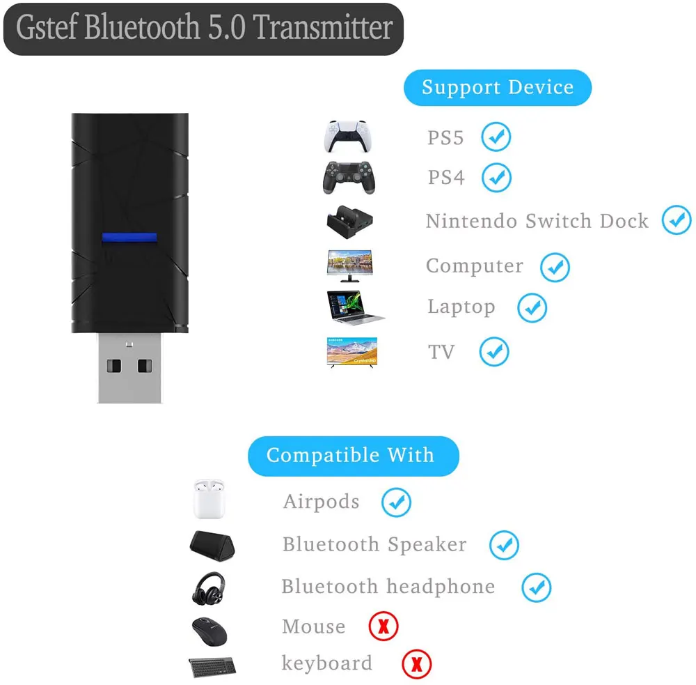 5.Простота в использовании: Без драйвера, plug & play. Просто установите наушники на состояние сопряжения bluetooth и Подключите этот bluetooth-аудио передатчик к PS5/PS4/Nintendo Switch Dock,PC,Mac, ноутбуку. Он сразу же подключится.