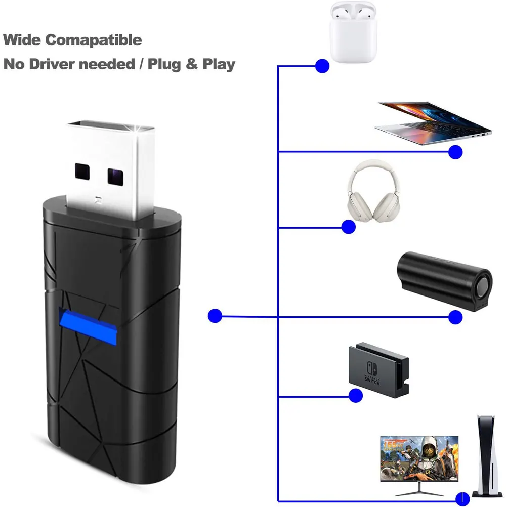 1. Широкое использование: Беспроводной адаптер Bluetooth 5,0 может быть совместим с вашим PS5,PS4,Nintendo Switch Dock,PC, Mac, игровая консоль и поддержка в игровом голосовом чате, чтобы наслаждаться высоким качеством звука для ваших любимых динамиков или наушников.