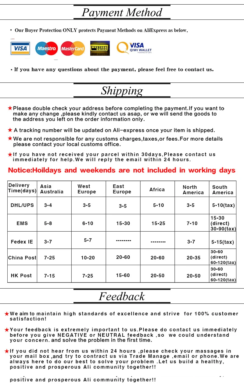 1. Если товар не совпадает с описанием или поврежден при транспортировке. Когда вы покажете нам фотографии, мы повторно отправим или вернем вам деньги. 2. По любой причине, вы не удовлетворены товарами, мы принимаем возврат и обмен в течение 7 дней после получения вашего товара, и вам нужно оплатить стоимость обратной доставки. 3. Если товар неисправен, пожалуйста, сообщите нам немедленно для замены или ремонта. Если замена недоступна, то возврат будет произведен с оригинальным методом оплаты.