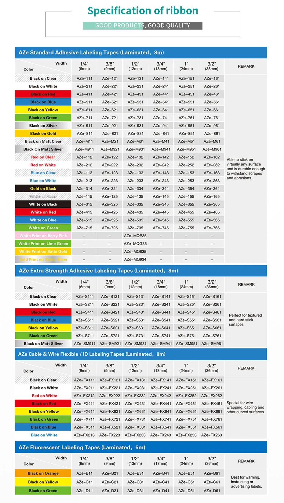 Информация о продукте: Стандартный ярлык (6/9/12/18/24 мм * 8 м) AZe-131 (черный на прозрачной) AZe-231 (черный на белом) AZe-431 (черный на красном) AZe-531 (черный на голубом) AZe-631 (черный на желтом) AZe-731 (черный на зеленом) AZe-831 (черный на золотом) AZe-931 (черный на серебристом) AZe-135 (белый на прозрачной) AZe-334 (золотой на черном) AZe-335 (белый на черном) AZe-435 (белый на красном) Красочные Стандартный ленты (6/9/12/18/24 мм * 8 м) AZe-131L1 (черный на прозрачной + лазерной клетчатой) AZe-231L1 (черный на белом + лазерный клетчатый) AZe-431L1 (черный на красном + лазерный клетчатый) AZe-531L1 (черный на голубом + лазерный клетчатый) AZe-631L1 (черный на желтом + лазерный клетчатый) AZe-731L1 (черный на зеленом + лазерный клетчатый) Матовый Бумага ленты (6/9/12/18/24 мм) AZe-M31 (черный на матовой прозрачной) 8 м AZe-M931 (черный на матовом серебре) 8 м AZe-MQP35 (белый на ягодном розовом) 5 м AZe-MQG35 (белый на извести зеленый) 5 м AZe-MQ835 (белый на сатиновом золоте) 5 м Бледно-Цвет матовый ленты (6/9/12/18/24 мм * 8 м) AZe-MQF31 (черный на пастельно-фиолетовый) AZe-MQ531 (черный на пастельно-голубой) AZe-MQE31 (черный на пастельно-розовый) AZe-MQY31 (черный на лимонно-желтый) AZe-MQG31 (черный на мятно-зеленом) Флуоресцентные светоотражающие ленты (6/9/12/18/24 мм * 8 м) AZe-B31 (черный на оранжевом) AZe-C31 (черный на желтом) AZe-D31 (черный на зеленом)