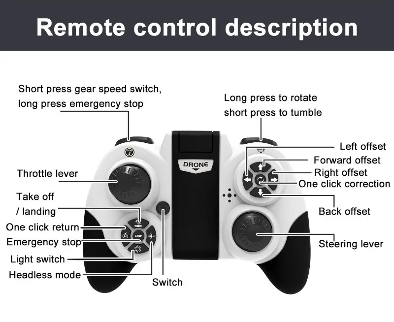 Основные функции: функция фиксированной высоты, с полным круговым светильник, шесть-Пасс с гироскопом; Одно-клавишное Снятие и одна-клавишная посадка, 360 градусов свернуть вперед и назад, вверх и вниз, вперед и назад, левая и правая сторона летит, рулевое управление, Безголовый режим