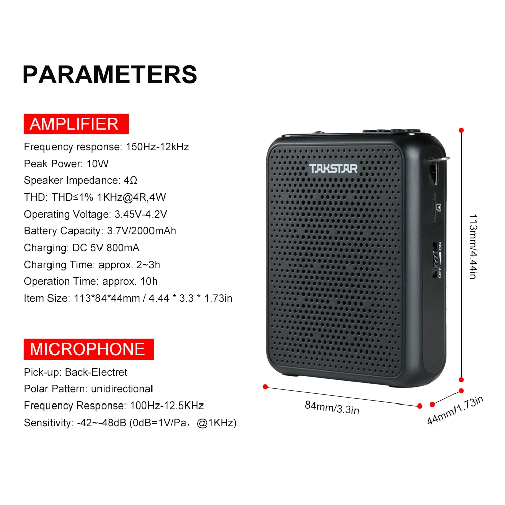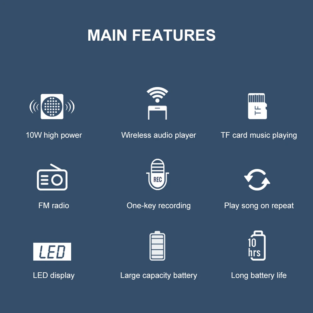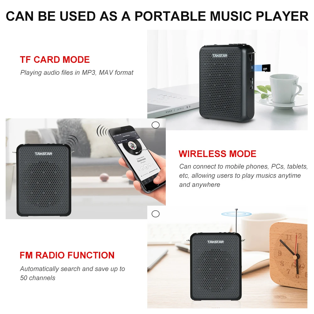 Этот высококачественный голосовой усилитель способен передавать громкий и чистый звук и обеспечивает множество функций, таких как аудио и музыкальный плеер, fm-радио и запись голоса и т. д., многофункциональный и полезный, широко используется в обучении, экскурсионном руководстве, презентации, рекламе и многого другого.