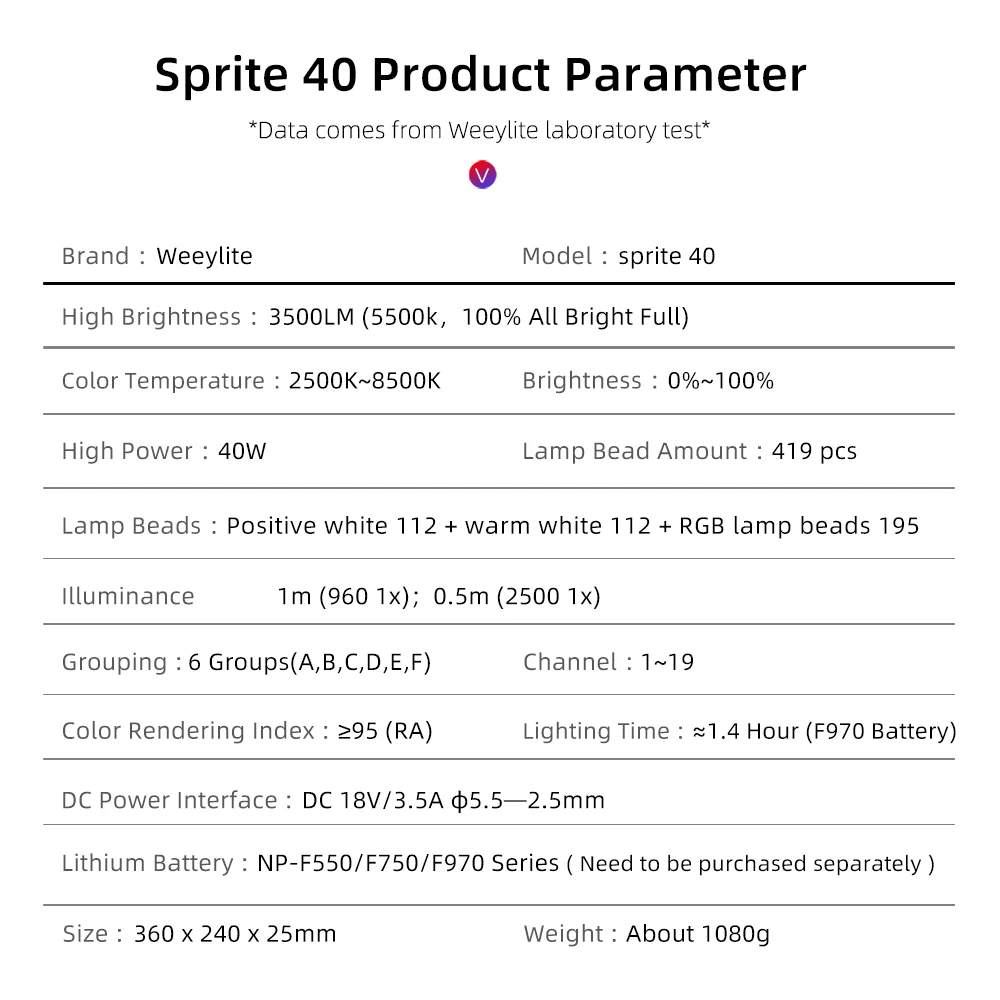 Мощность (макс.): 40 Вт Бусины лампы: 419 шт. Цветовая температура: 2500K ~ 8500K (регулируемая) Яркость: 0%-100% (регулируется) Диапазон насыщенности цвета: 0-360 ° Макс. Макс. Яркость: 3500LM (5500k, 100% полный) Источник питания: источник питания постоянного тока (DC18V/3.5A, 5,5 5,5-2,5 мм) Литий-ионный аккумулятор: серия NP- F550 / F570 / F960 / F970. (Батарея в комплект не входит) Размер: 360x240x25мм Вес: 1,08 кг