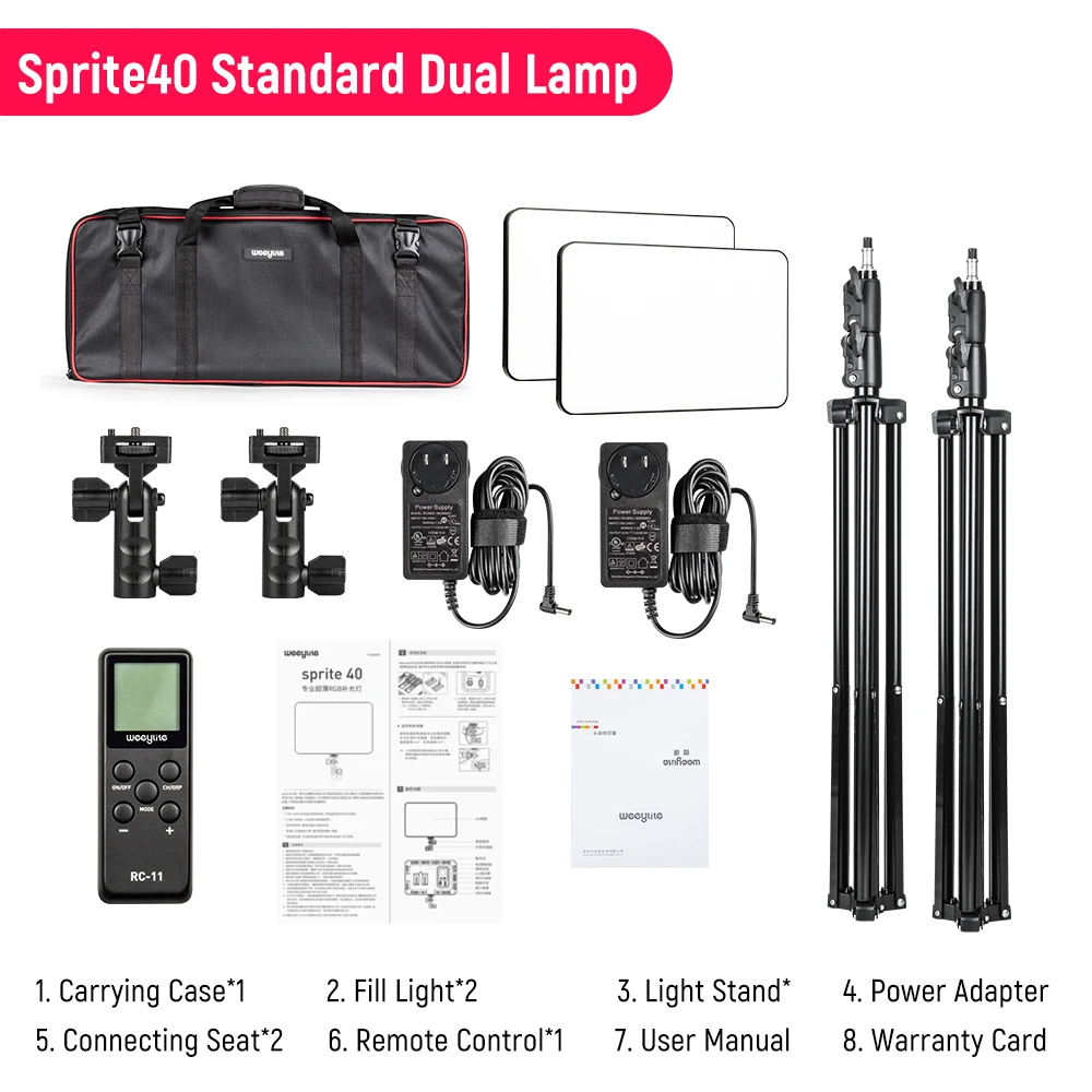 2 * RGB видео светильник 2 * Адаптер питания 1 * беспроводной пульт дистанционного управления 2 * Адаптер для горячего башмака 2 * Штатив 1 * сумка для переноски Примечание: батарея в комплект не входит.