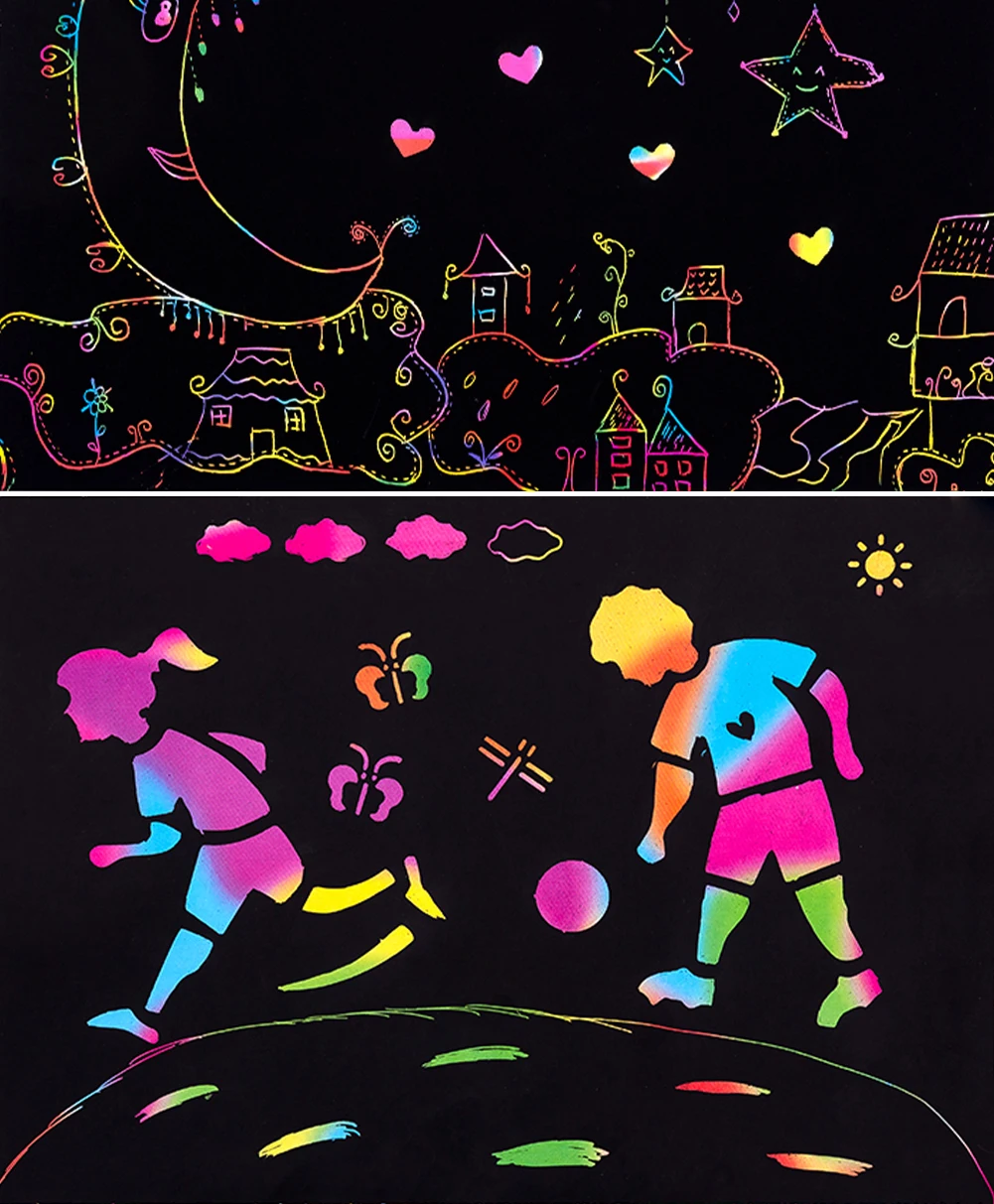 Рисунок стилусом, чтобы поцарапать черную матовую поверхность доски для рисования, раскрывая фон, настолько потрясающий для творческих работ, вывесок и слов! Изделия против царапин rainbow art отличаются яркими цветами и узорами, скрытыми под матовым покрытием, а также деревянным стилусом, открывающим их с помощью простой царапины.