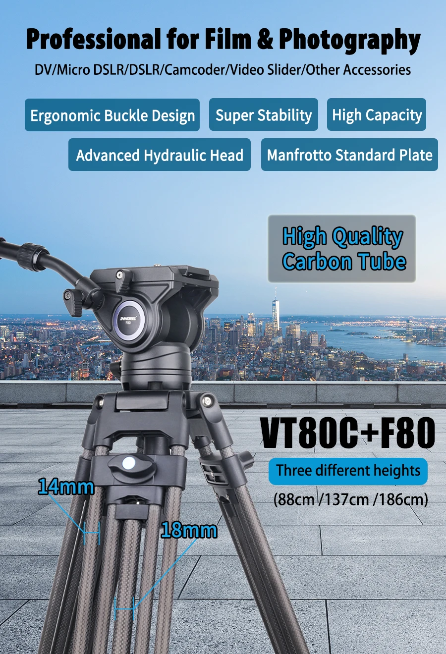 Model :VT80C+F80 Material :High quality carbon fiber Sections :3 Max Height :186cm Max Load :12kg Tube Diameter :14/18mm Net Weight : 3.92kg Folded Length :92cm Head :F80 Video fluid head Screw Size :1/4" & 3/8"
