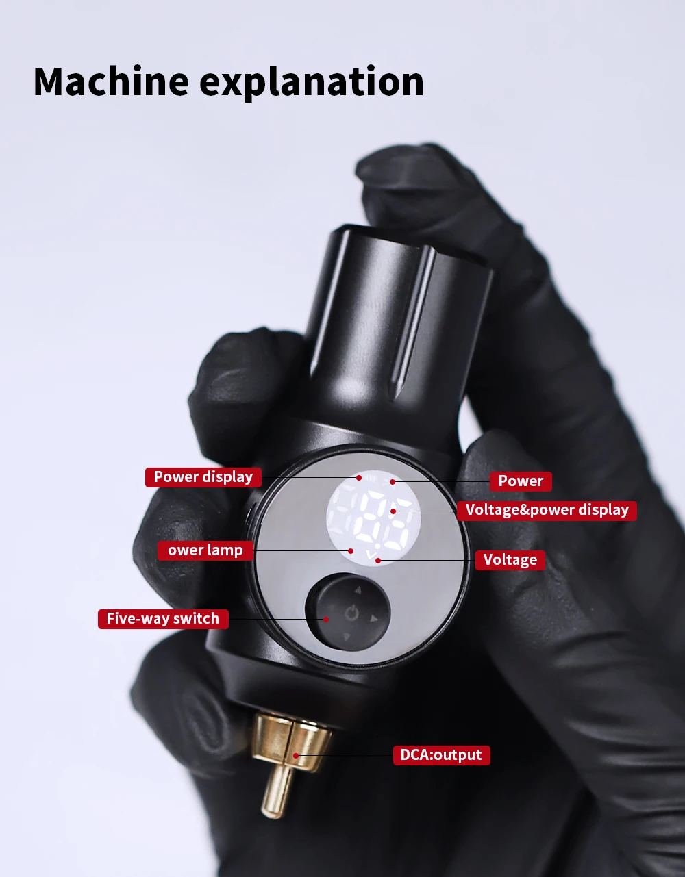 Тип изделия: Мини-источник питания для тату Интерфейс: RCA Интерфейс Емкость аккумулятора: 1500 мАч Выходной ток: 2.0A Рабочее напряжение: 4,5 V-12V Время зарядки: быстрая зарядка Полная зарядка: 5 часов Время работы: 4-6 часов Вес: 70 г