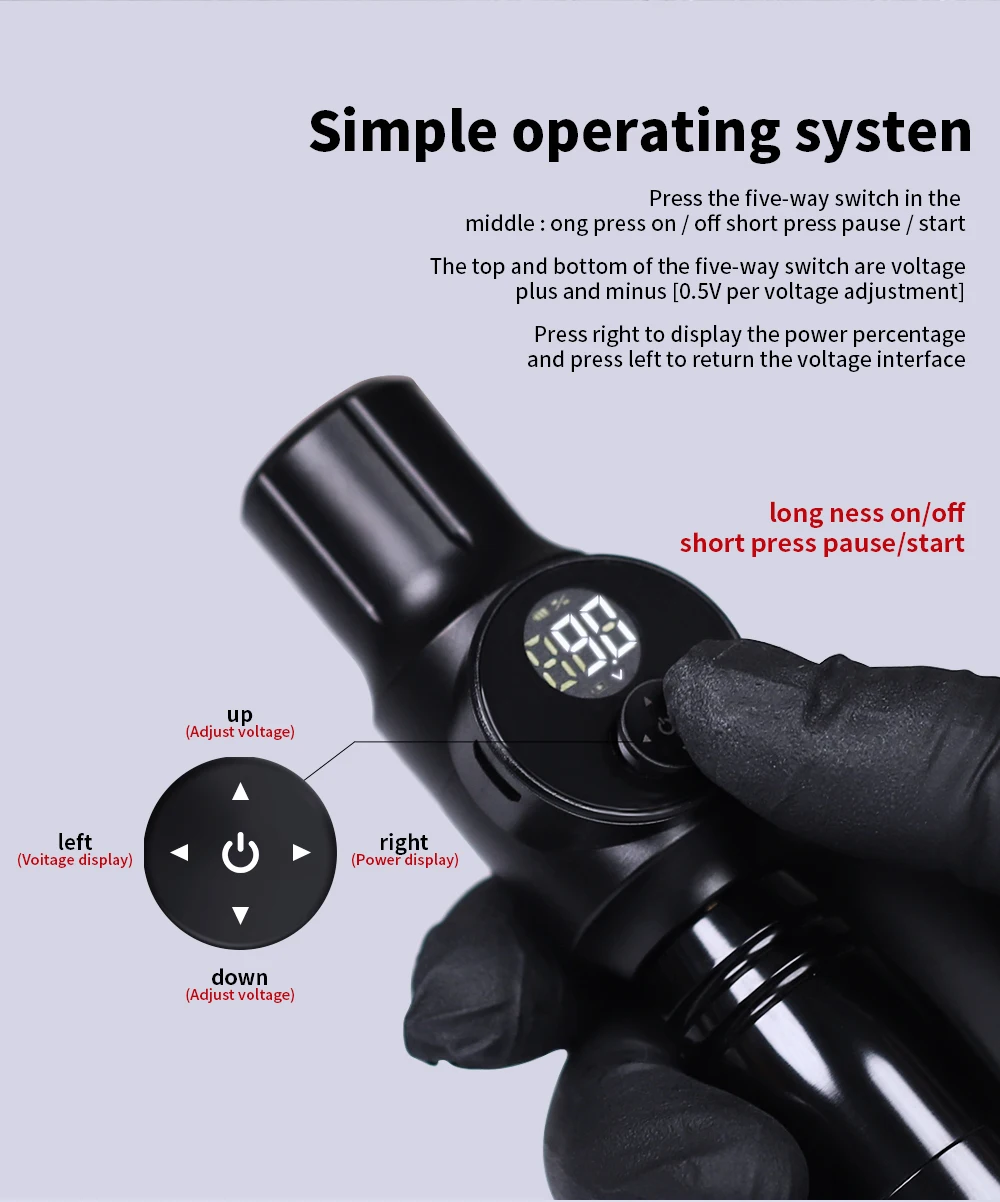 1. Нажмите пятисторонний переключатель посередине: Нажмите и удерживайте кнопку ВКЛ./ВЫКЛ., нажмите кнопку «пауза»/«СТАРТ» 2. В верхней и нижней части пятипозиционный переключатель представляют собой напряжение плюс и минус [0,5 v для регулировки напряжения] 3. Нажмите вправо, чтобы отобразить процент мощности и нажмите влево, чтобы вернуть интерфейс напряжения 4. В том случае, если мощность менее 19%, индикатор зарядки будет мигать: Подключите зарядное устройство и лампу остаться на 5.100% полная мощность, полный светодиодный светильник Примечание: Не используйте зарядное устройство выше 5 В.