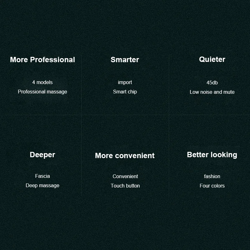Высокая скорость шумоподавления двигателя, сильная мощность, низкий уровень шума вибрации; Использовать повышенную мощность двигателя, принести сильную и повышенную мощность; 3200 об/мин высокая скорость удара, облегчить мышечную боль после физических упражнений.