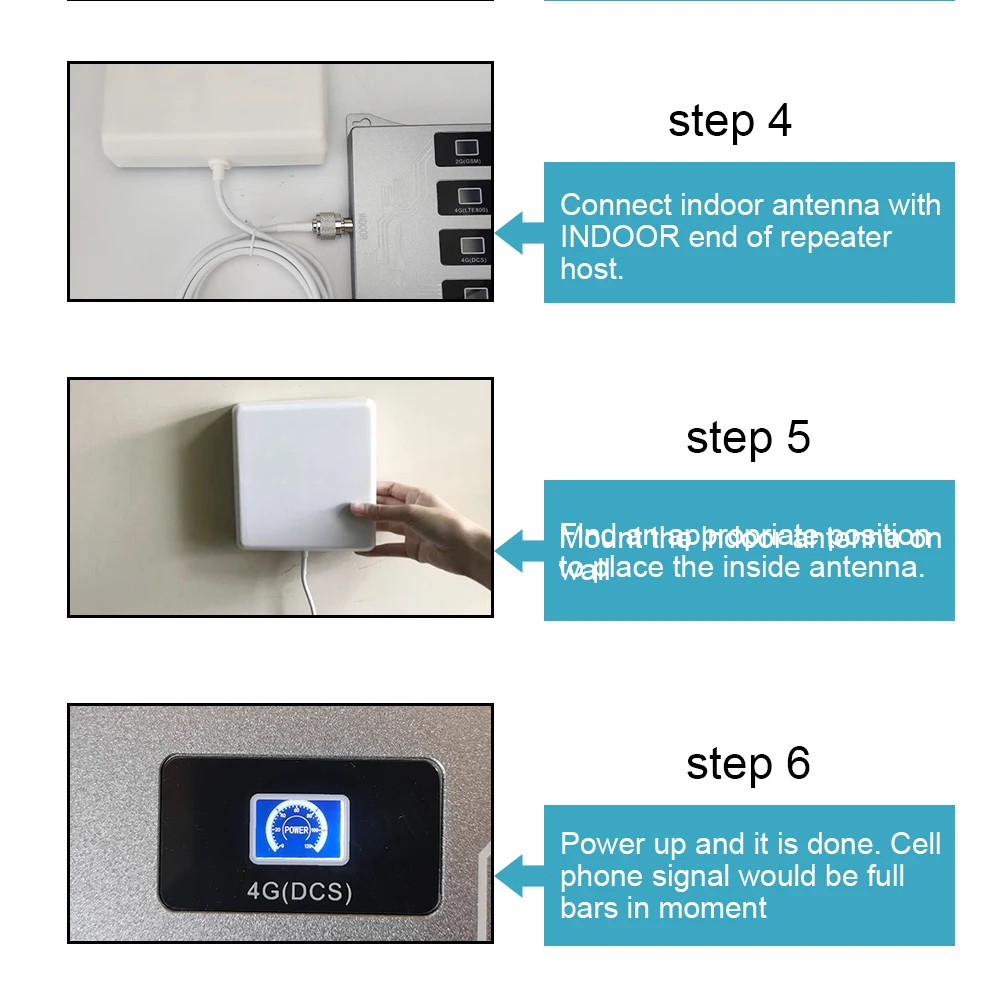 1. Установите наружную антенну на крыше, лицом к сигнальной башне. 2. Соединяет один конец коаксиального кабеля 13 метров с наружной антенной. 3. Запуск коаксиального кабеля в комнату, соединяет другой конец кабеля с концом «BTS» хоста ретранслятора. 4. Подключите внутреннюю антенну с "MS" концом хоста ретранслятора. 5. Установите внутреннюю антенну на стену. 6. Питание и сделано. Сигнал на мобильный телефон будет заполнен в настоящий момент.