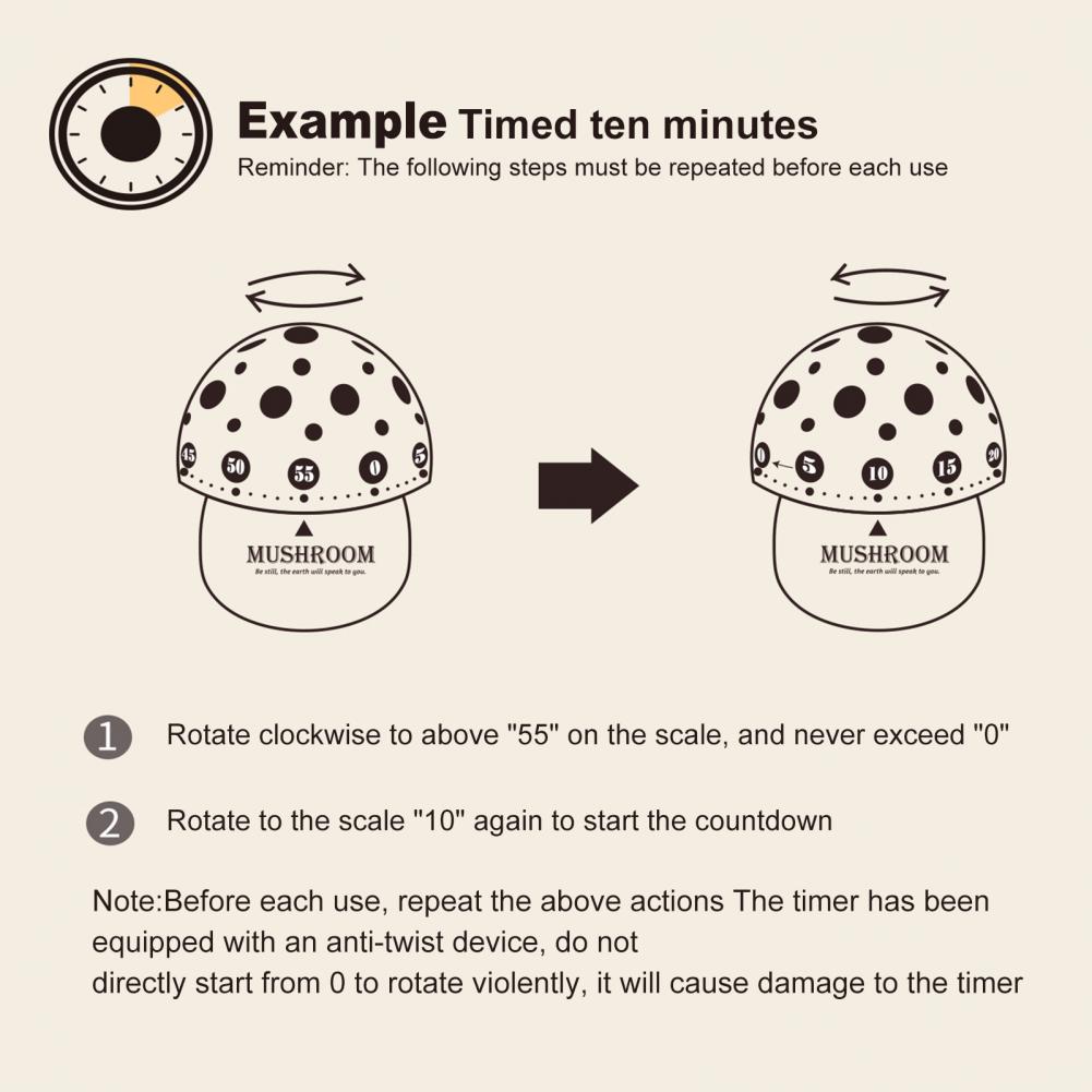Использование метода: поверните по часовой стрелке сначала до более 55, не более 0, затем поверните назад до 10, это начнет обратный отсчет. Вы должны повторить эту операцию для использования evey time. Не обращайте внимание на обратное вращение от 0, это повредит этот таймер.