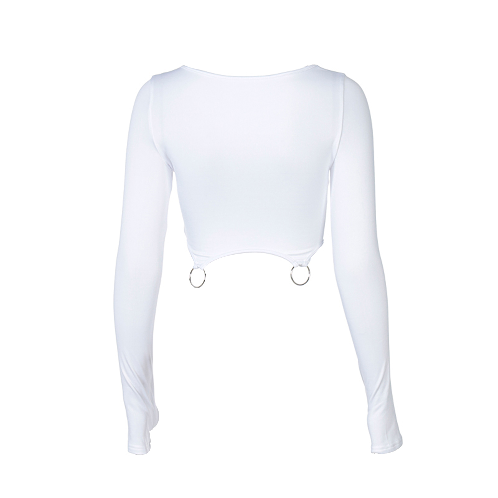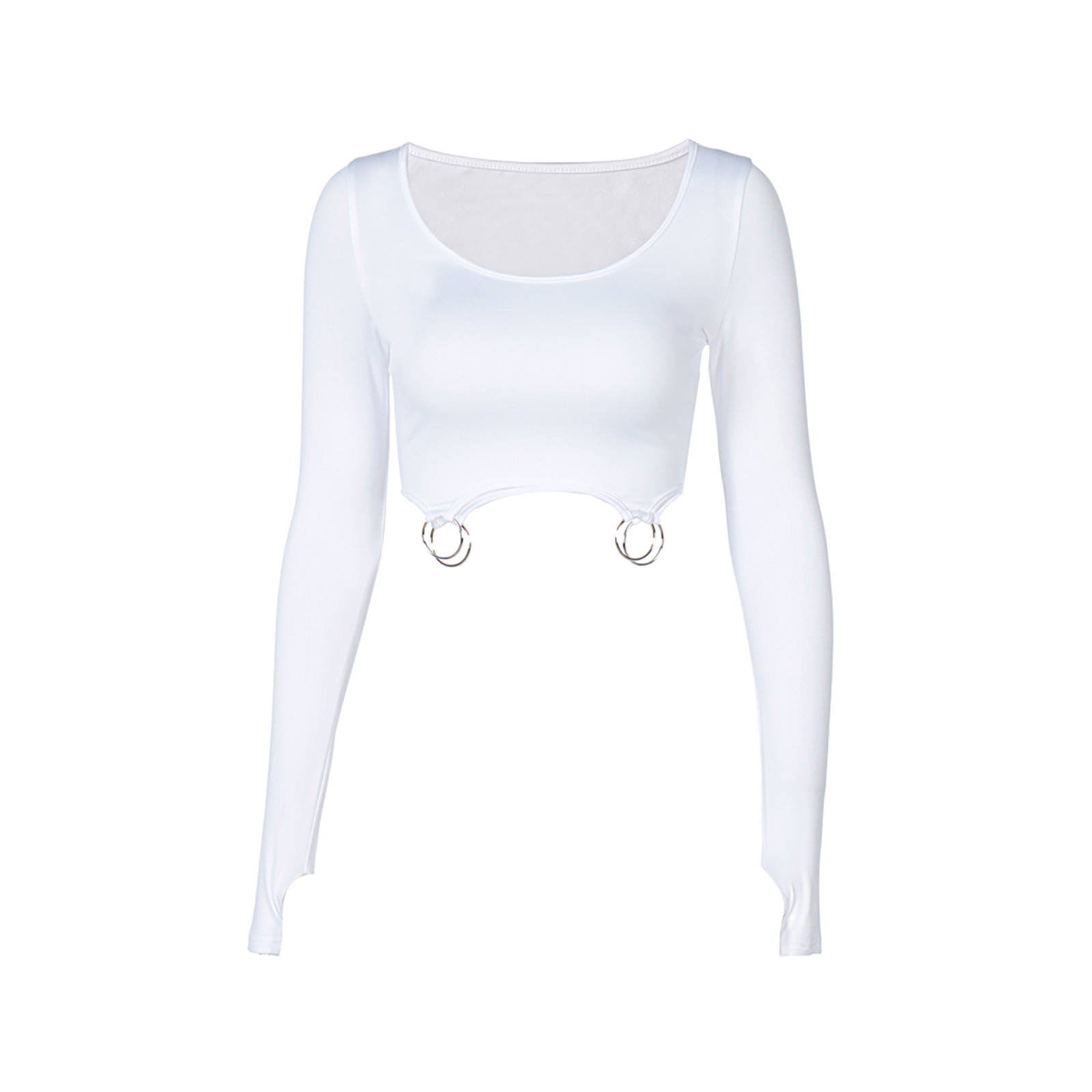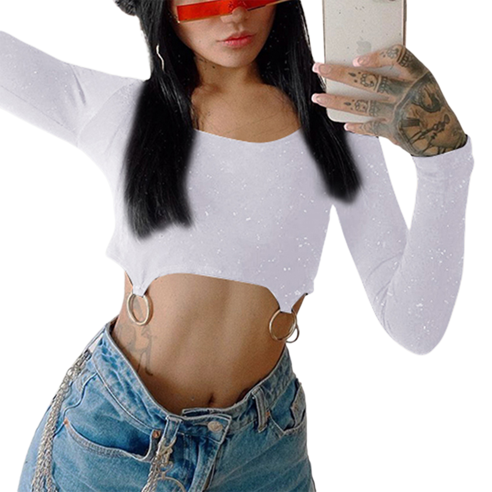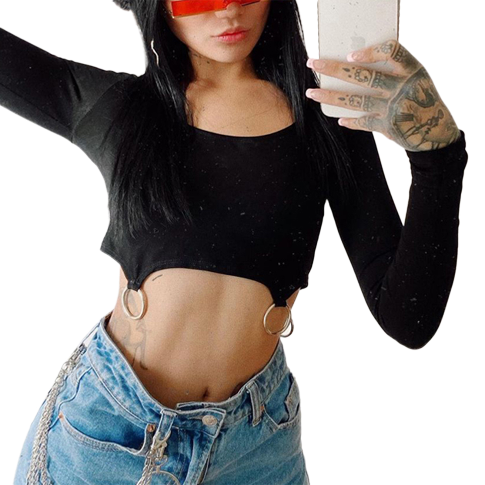 Женский сексуальный укороченный топ, повседневная с длинным рукавом и круглым вырезом, приталенная обычная футболка с кольцами
