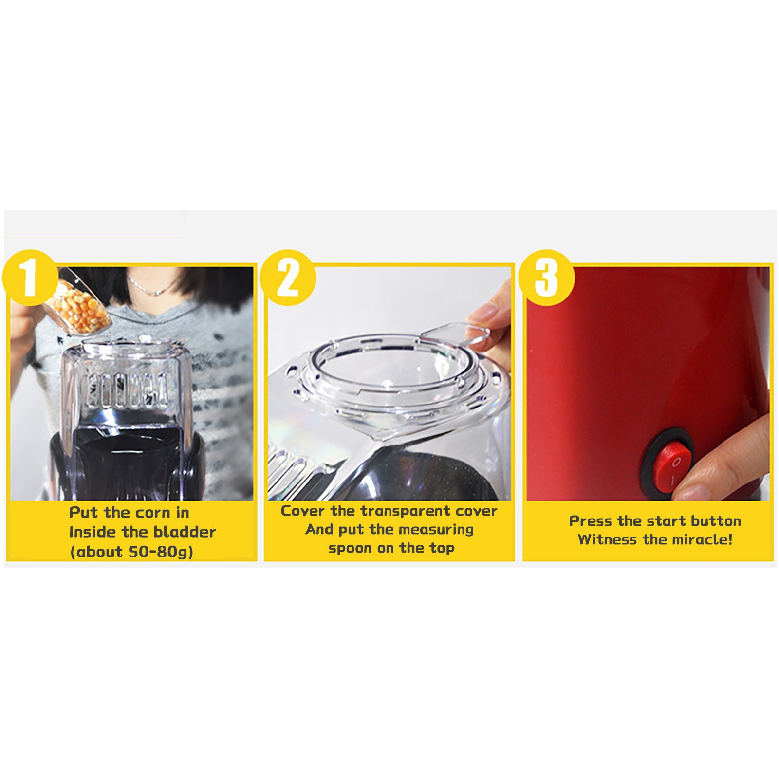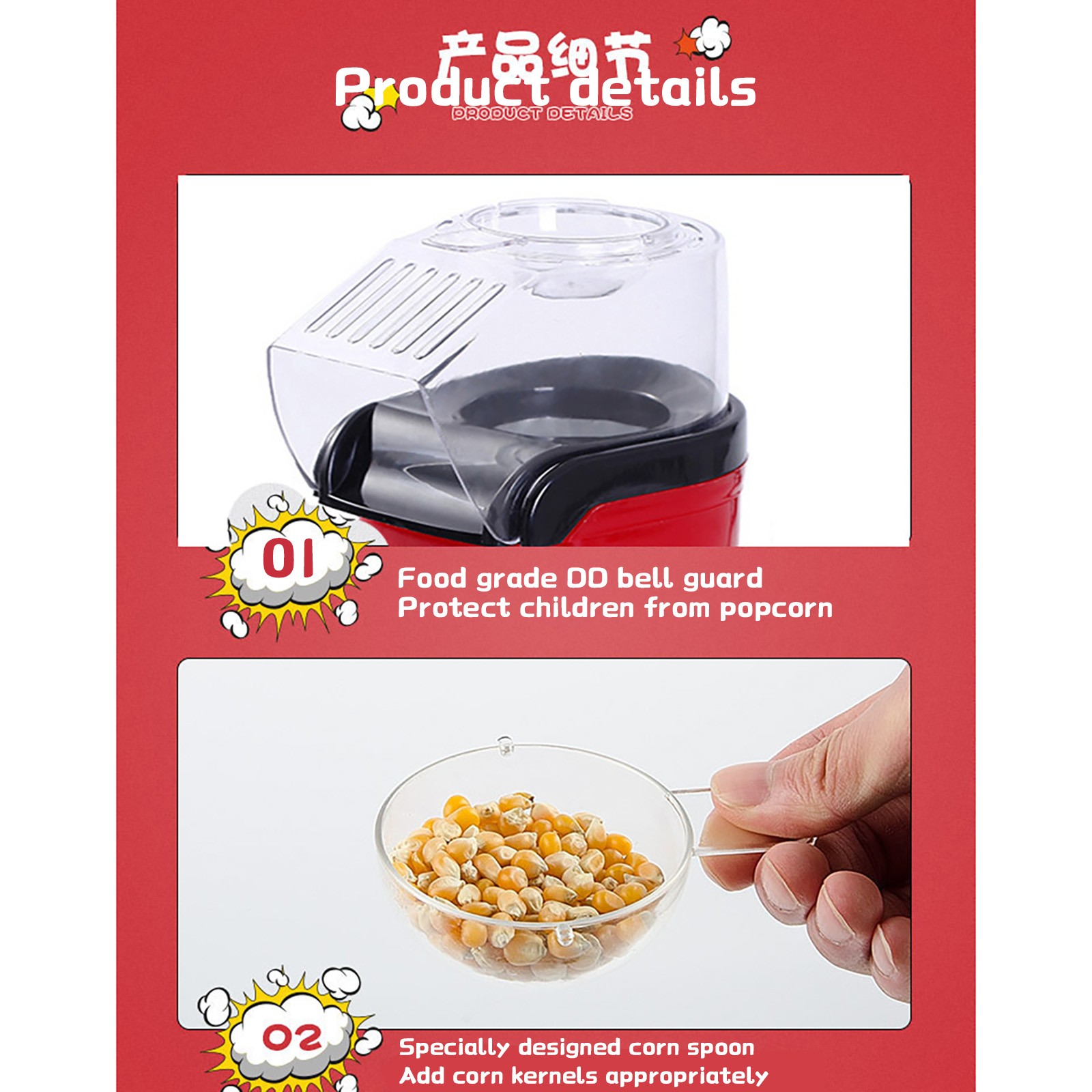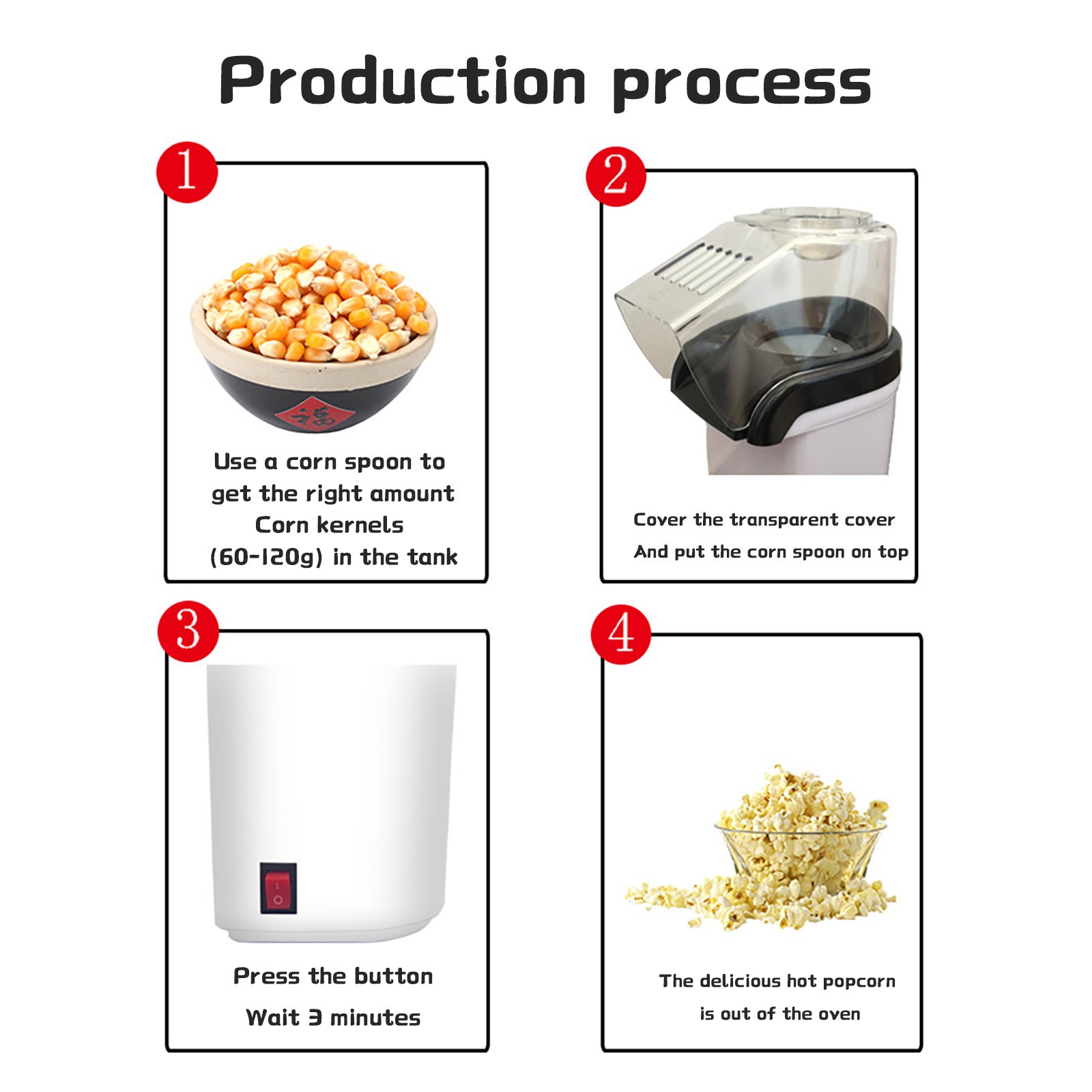 Свежий и здоровый-нет необходимости в избытке насыщенного жира-горячий воздух, это все, что вам нужноЖареныйДомашний попкорн! Неполный и вкусный, натуральный, без соли или искусственных ароматов. Конечно, если вы хотите съесть более вкусные закуски, вы можете добавить немного масла или соли и приправ после появления кукурузы. Мерная ложка в два раза больше, чем у плавильной ложки, поэтому вы можете даже растопить масло теплом экструдера при использовании экструдера!