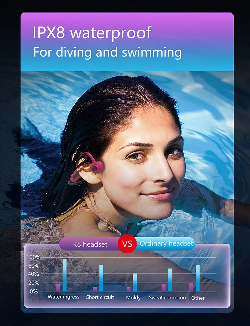 K8 костной проводимости наушники для плавания является IPX8 Уровень сертификации гарнитуры, которая может плавать 10 метров под водой.