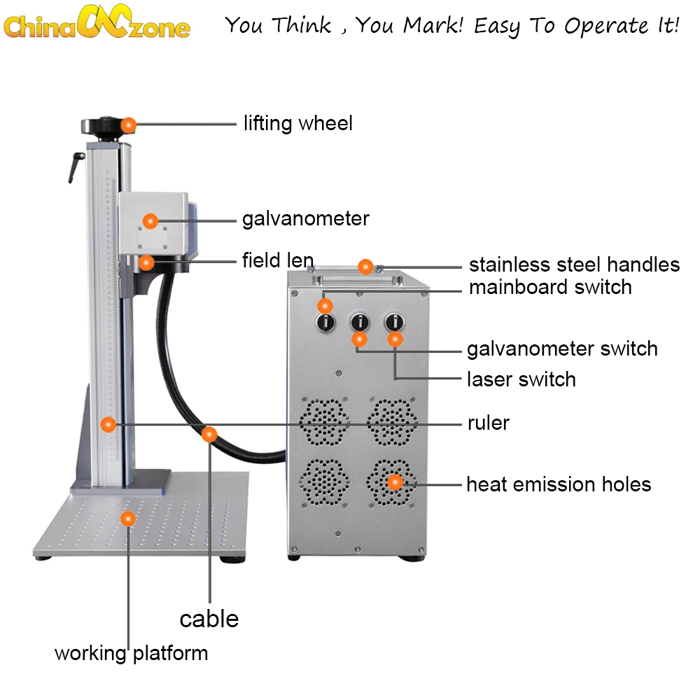 Волоконно-лазерная маркировочная машина в основном состоит из четырех частей:Волоконный лазер, Система сканирования гальванометра, компьютерная система управления и рабочий стол.