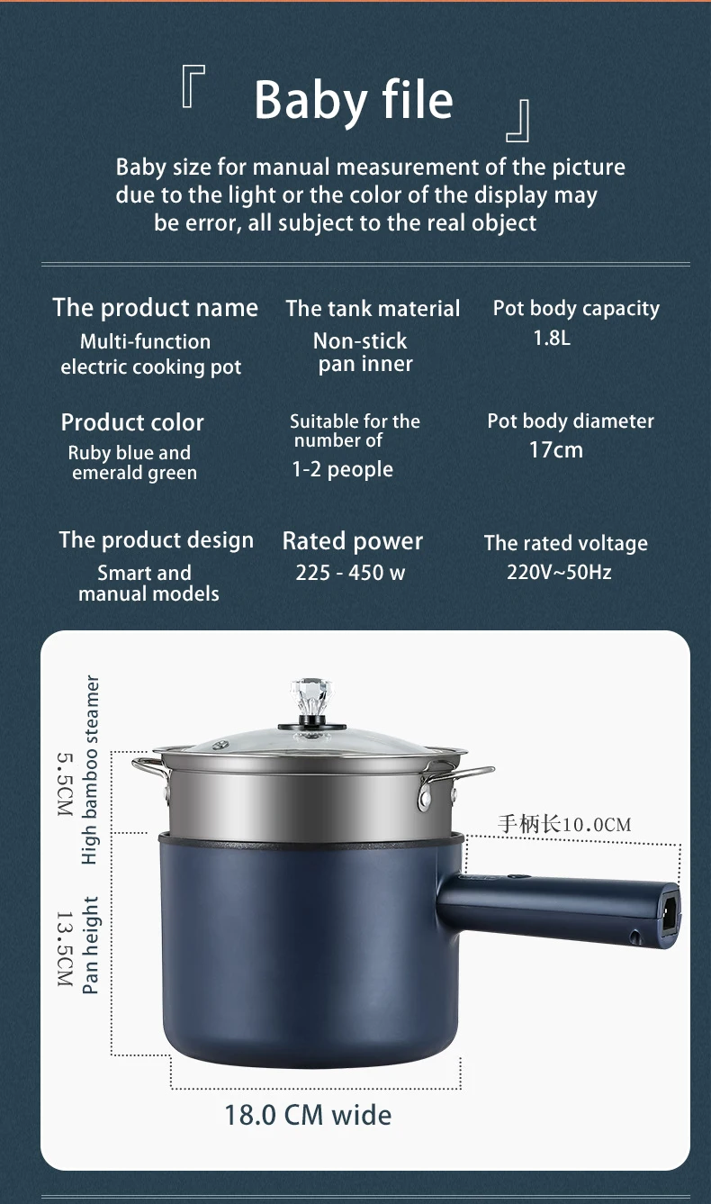 Емкость кастрюли: 1,8 л Размер корпуса горшка: 17 см Стиль изделия: руководство пользователя Номинальная мощность: 225-450 Вт Номинальное напряжение: 220-50 Гц Отпариватель высота: 5,5 см, Высота 13,5 см, горшок для тела ширина; Высота каблука 18 см, Длина ручки: 10 см Материал: Паровая сетка из нержавеющей стали Алмазные антиобжигающие верхние бусины (акриловый материал) Материал подкладки: Tao Jing Материал корпуса пластик Примечание: 1. Допускается погрешность в 0-1 см из-за ручного измерения. 2. Цвет товара, отображаемый на фотографиях, может немного отличаться на мониторе вашего компьютера, так как мониторы не откалиброваны так же. 3. Если у вас есть какие-либо вопросы о продукте, пожалуйста, свяжитесь с нами, мы будем терпеливо отвечать за вас!