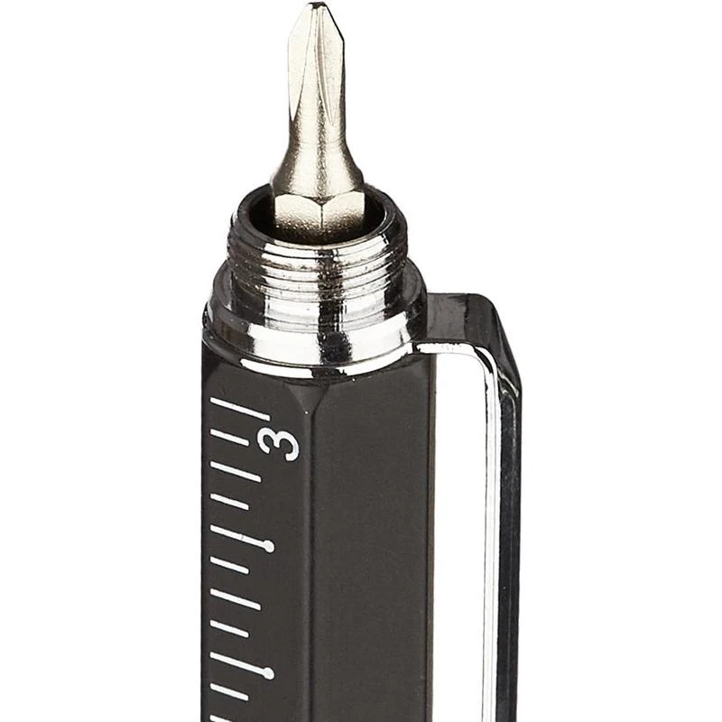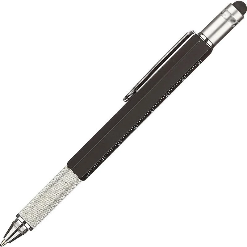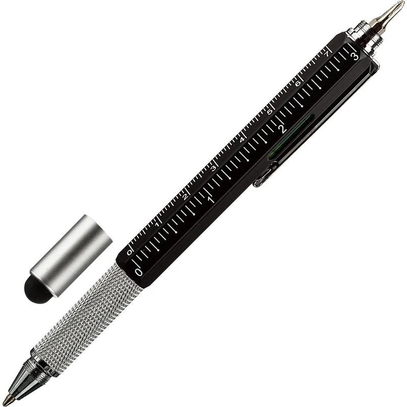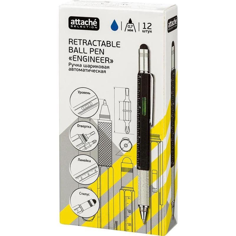 Описание Ручка шариковая Attache Selection, корп.черн,с уровн иотверткой,ст.син,автАвтоматическая шариковая ручка Attache Selection Engineer выполнена в алюминиевом шестигранном корпусе черного цвета. Ручка оснащена металлическим клипом, позволяющим плотно закрепить ее в кармане или тетради для записей. Рифленая поверхность зоны захвата предотвращает скольжение пальцев при письме. Толщина линии письма - 0,7 мм. Цвет чернил - синий. Ручка обеспечивает легкое и мягкое письмо, яркие и насыщенные линии. Многофункциональная ручка сочетает в себе следующие функции: ручку, стилус, измерительный уровень, линейку с двойной градацией шкалы (сантиметр, дюйм), две отвертки (крестовая, плоская). Данная ручка предназначена для работы строителей, инженеров, конструкторов, а также работы по дому. Расходные материалы для данной ручки не представлены в ассортименте производителя и в ассортименте компании Комус.