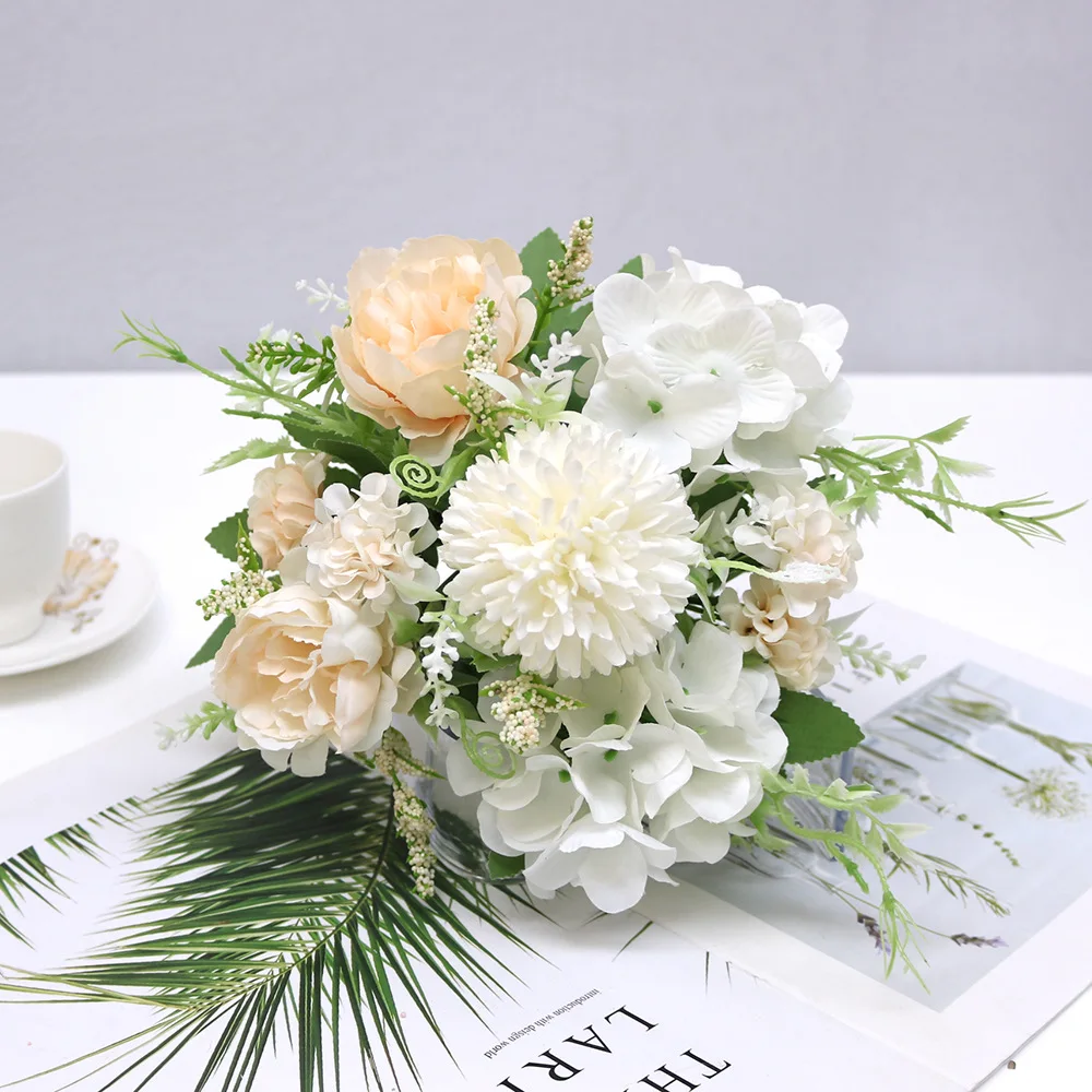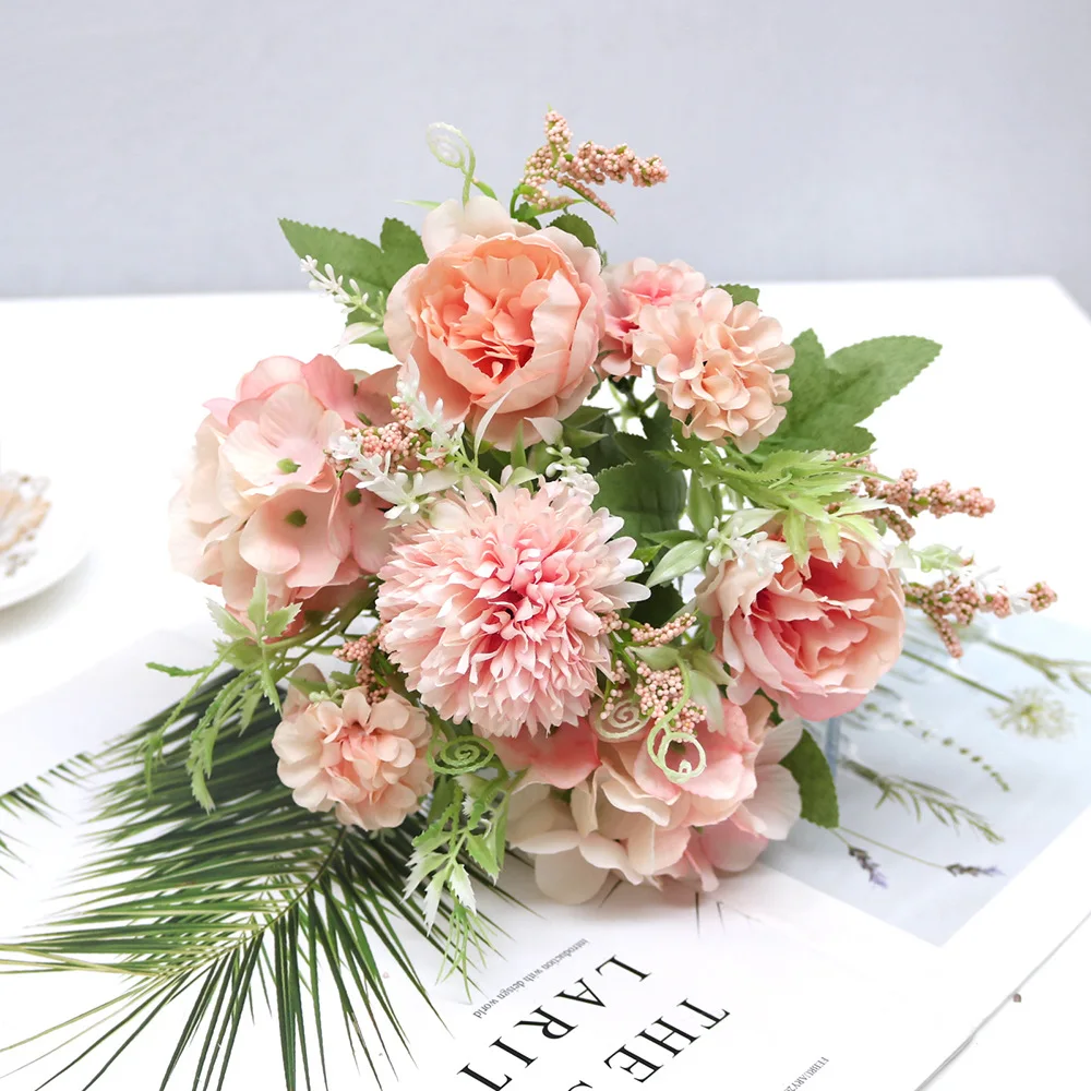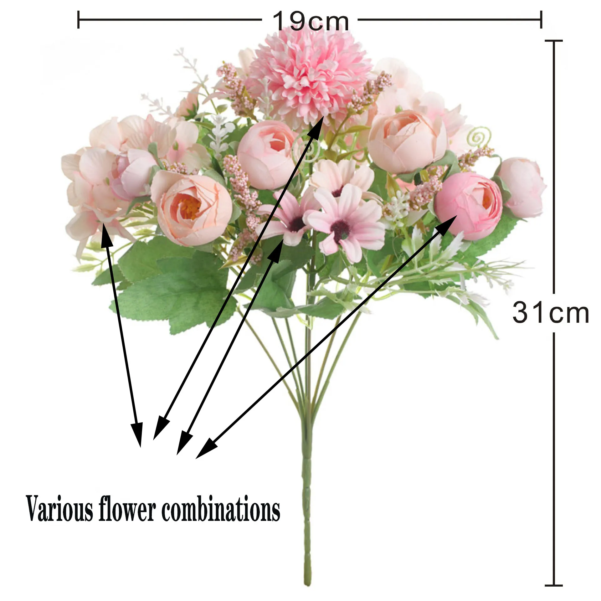 Упаковка: 1 шт., 7 веток в общей сложности, Количество цветов: (6 чайных бутонов, 2 гортензии, 3 хризантемы, 1 луковый шар, 6 наборов листьев и различных материалов листьев). Общий цветочный материал богатый и уникальный, а Цветочная композиция простая и экономичная.