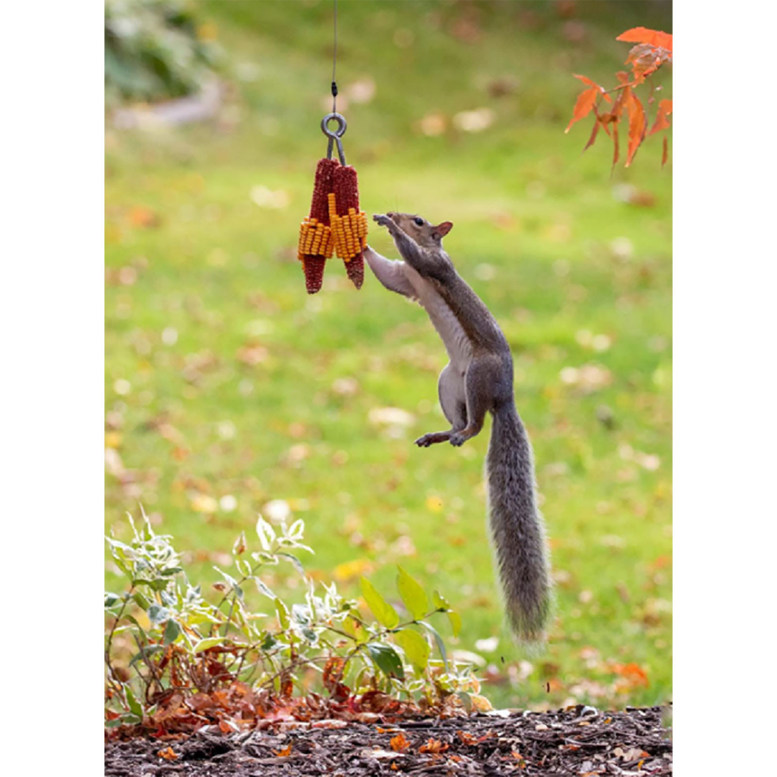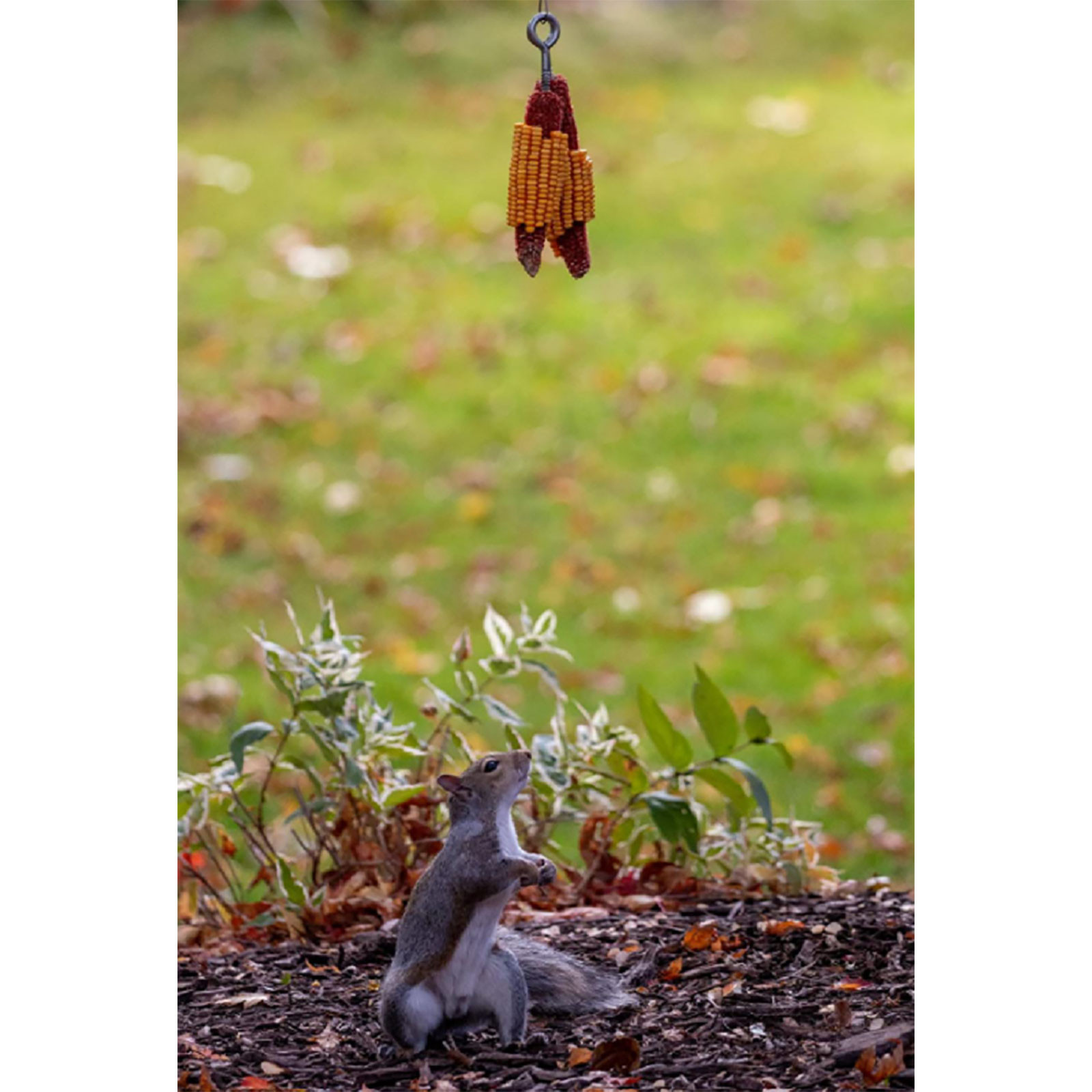 -Когда белки прыгают и захватывают кукурузу, они держатся. В то время как они держат и вытягивают ядра, их вес и гравитация подскакивают их вверх и вниз около 12-18 дюймов, пока они вращаются и качаются. Мы даже видели белки с ног на голову!