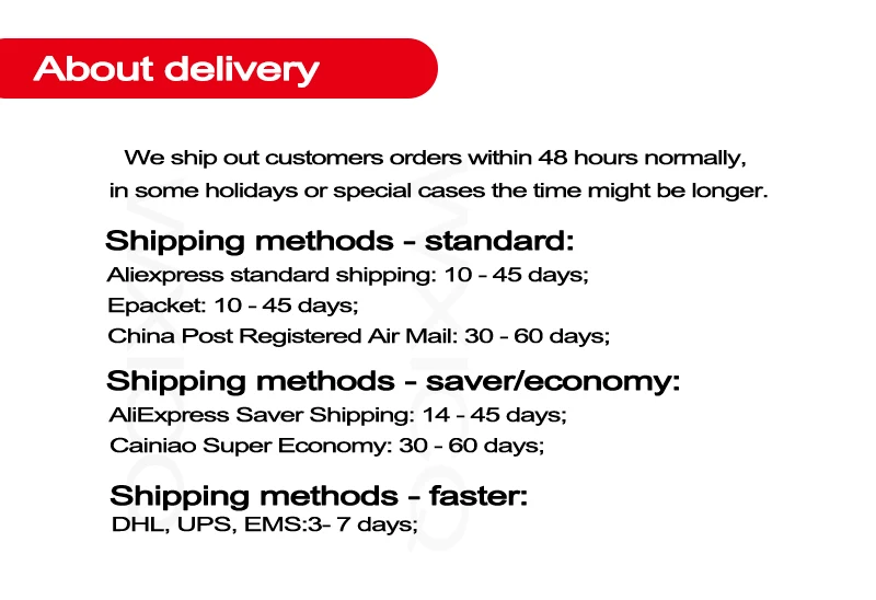 Уважаемый клиент, 1. Перед отправкой курьерской посылка для каждого продукта, мы проверим каждую деталь продукта, чтобы убедиться, что продукт не имеет проблем с качеством. 2 Мы будем использовать профессиональные упаковочные материалы для защиты вашего продукта и предотвращения повреждения продукта. Вы можете купить этот товар с уверенностью