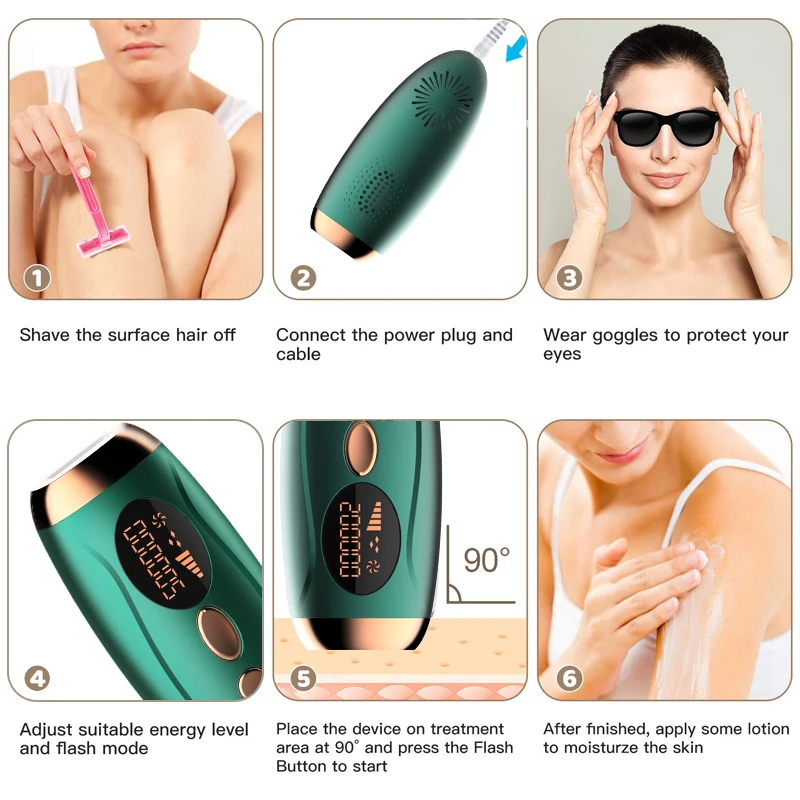 Наше устройство для удаления волос разработано профессиональной командой, применяя технологию IPL с безопасной и эффективной, легко используется дома. По сравнению с постоянным воском, бритьем или выщипыванием, наша модель более проста, удобна и безвредна в использовании, придавая Вам большую гладкость кожи! Вы можете получить эффект удаления волос как салон красоты и потратить меньше денег.