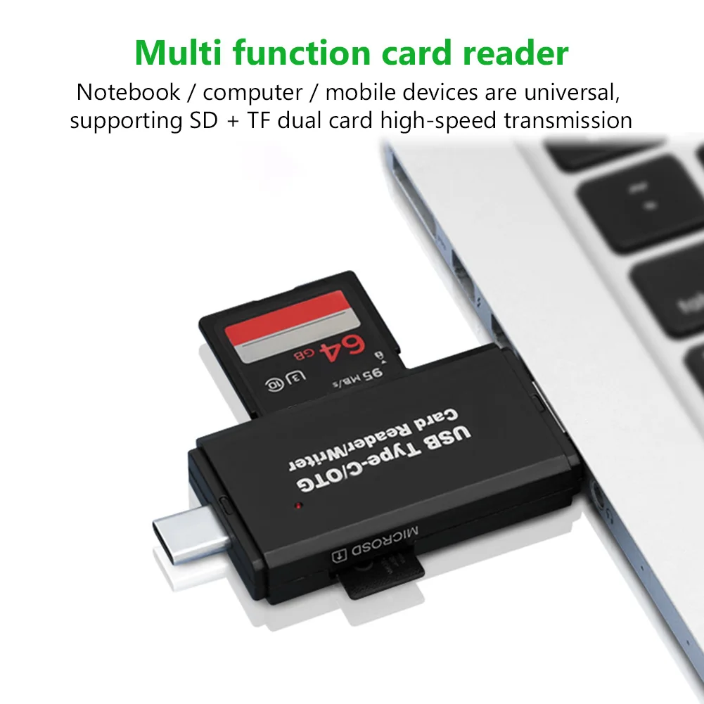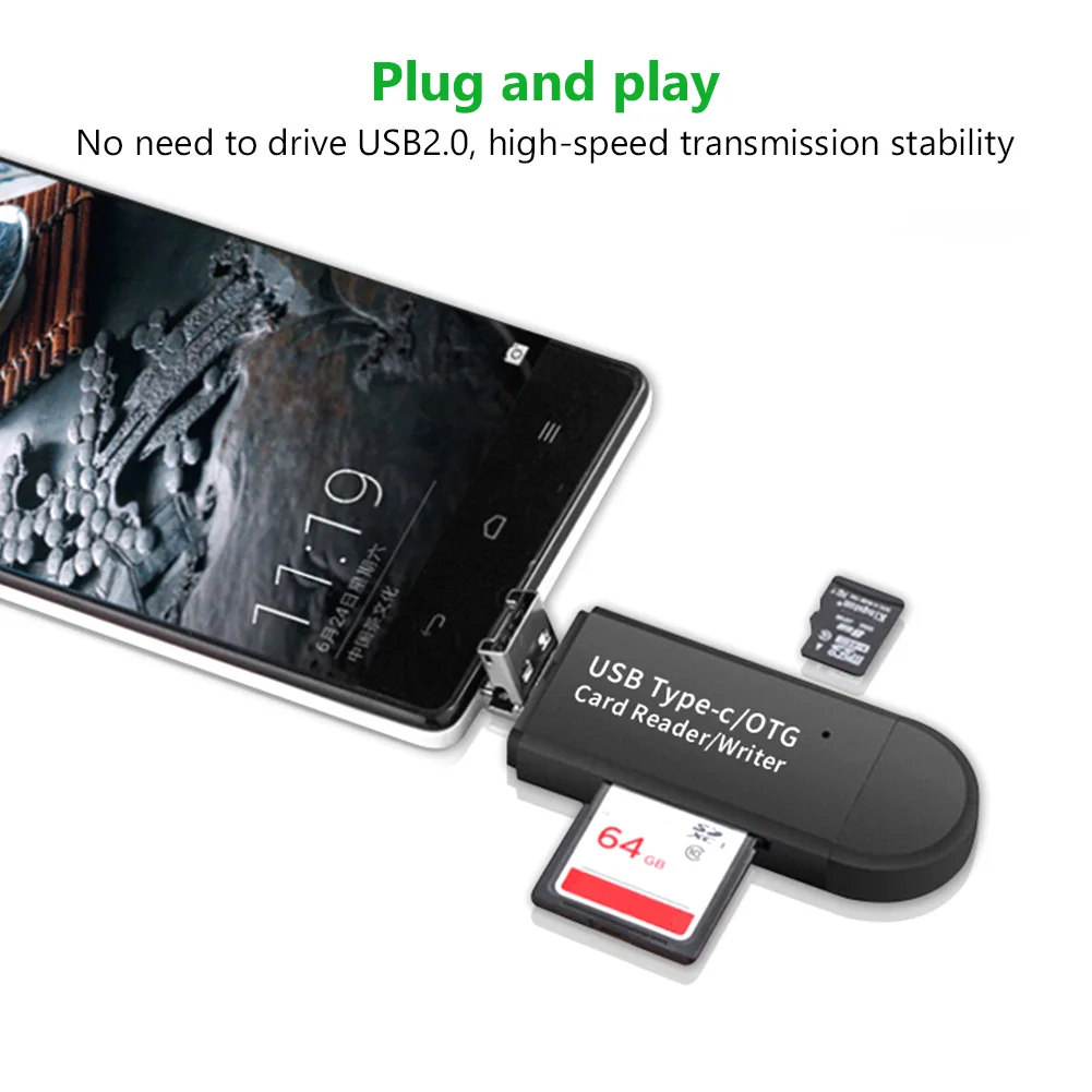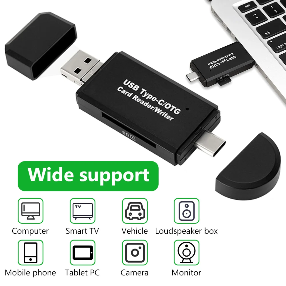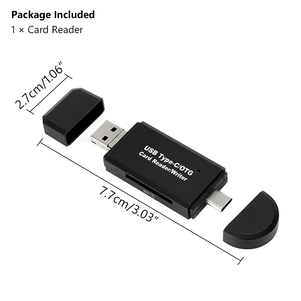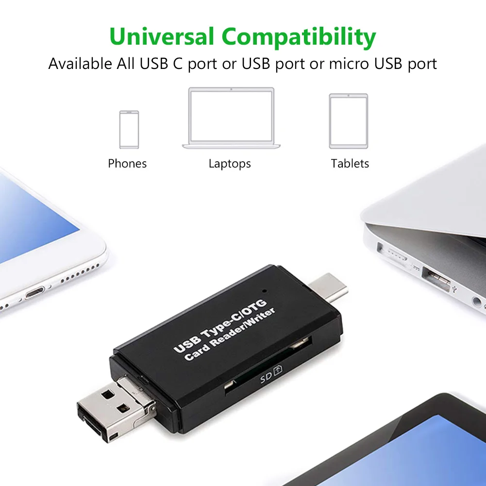 Стандартный разъем USB 2,0 и разъем micro USB, сочетание USB C, что делает этот кардридер совместимым со всеми устройствами USB C и планшетами и смартфонами Android, которые поддерживают функцию OTG.
