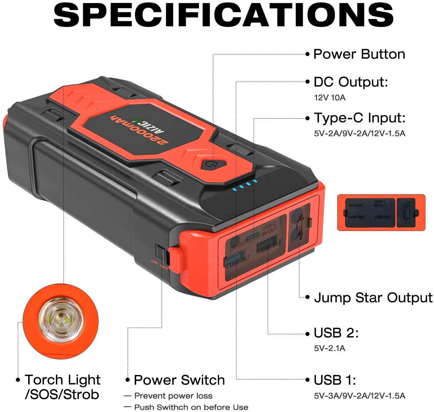 Светодиодный фонарик: не только автомобильное зарядное устройство, автомобильный усилитель A12 оснащен супер ярким светодиодный фонарик, работающий как аварийный фонарик. Сине-Красный Альтернативный светильник может служить сигналом предупреждения об опасности дорожного движения в случае аварии. Это многофункциональная спасательная машина с сигналом SOS.