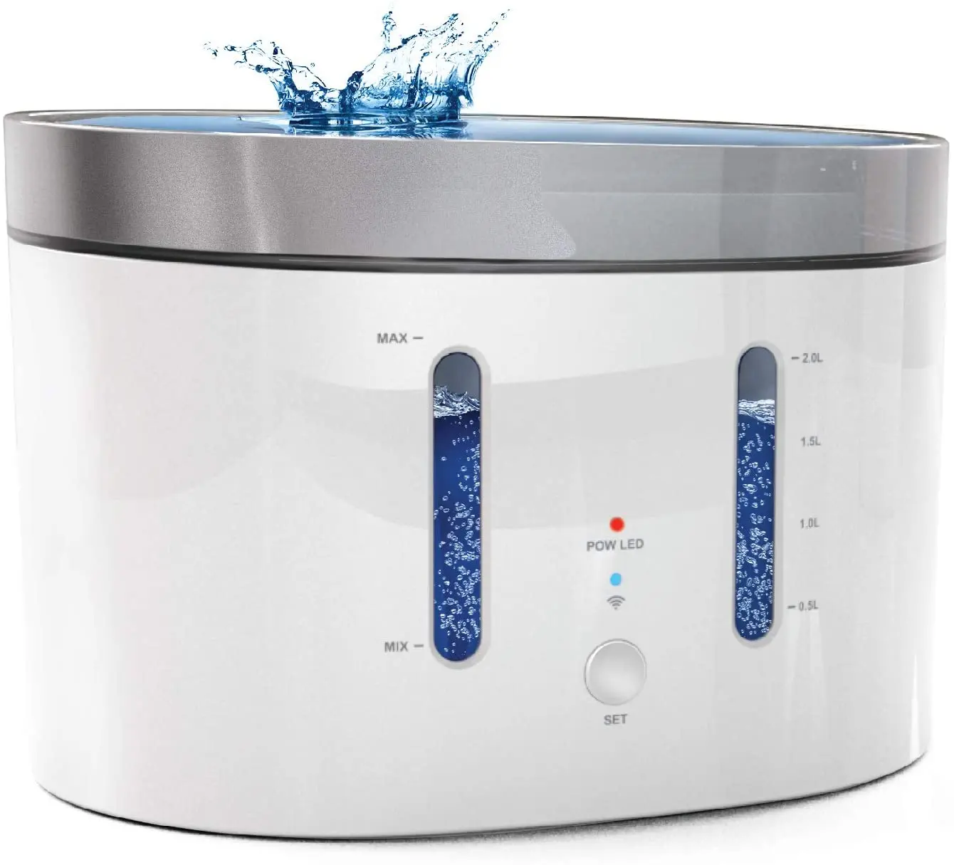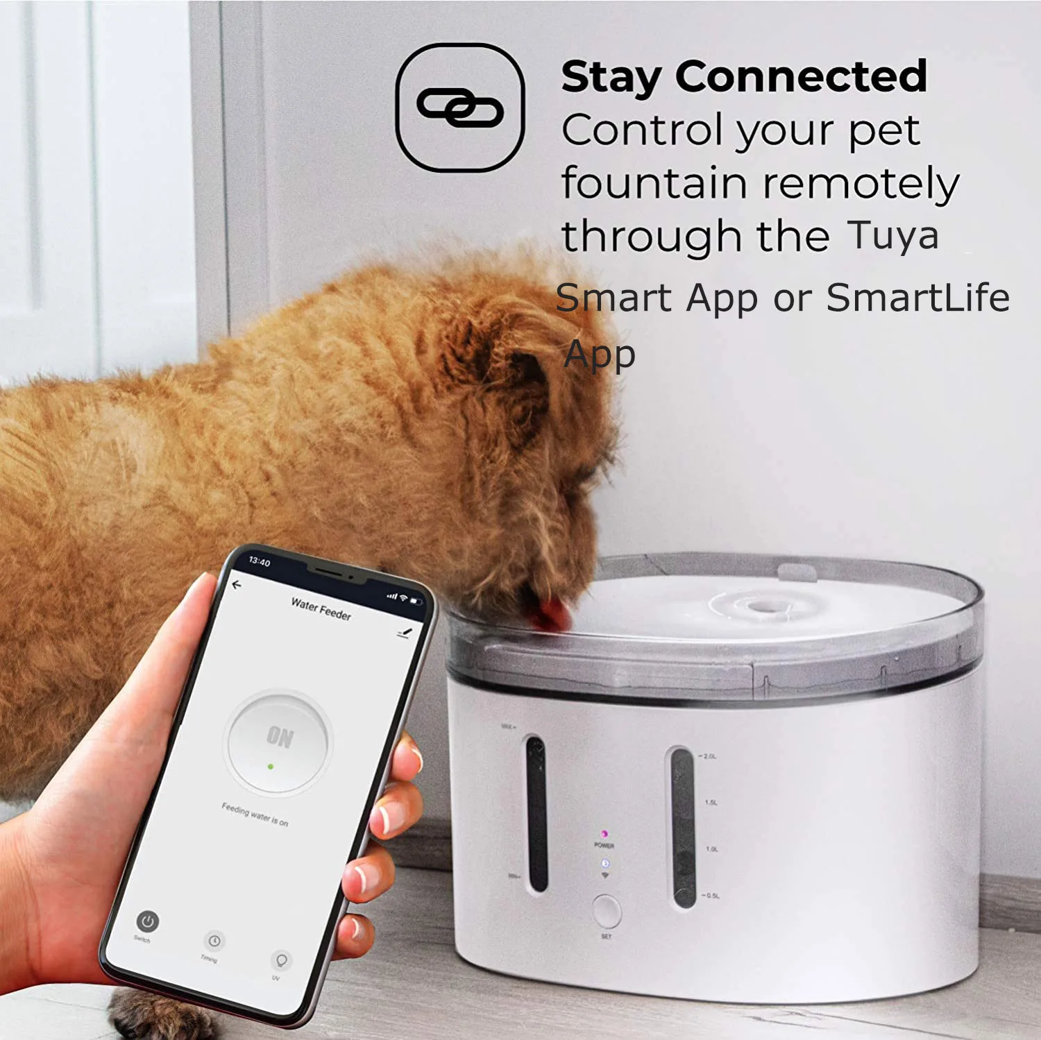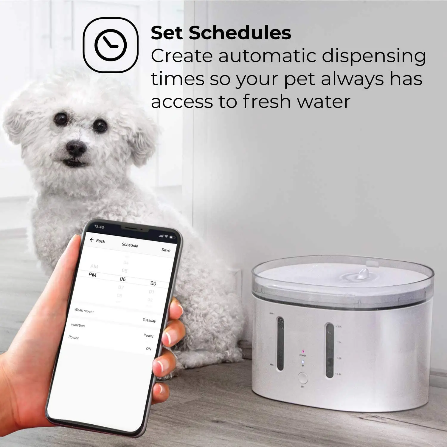 2. Установите графики: оснащен большой емкостью воды 2 л, создавайте автоматические графики дозирования через приложение, чтобы ваш питомец оставался увлажненным в течение всего дня. Примечание: Перед использованием проверьте наличие трещин или повреждений в прозрачной воде и свяжитесь со службой поддержки клиентов, если обнаружены какие-либо повреждения.