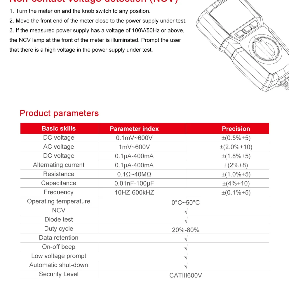 Включая тест NCV, испытание рабочего цикла, сохранение данных и функции автоматического отключения.