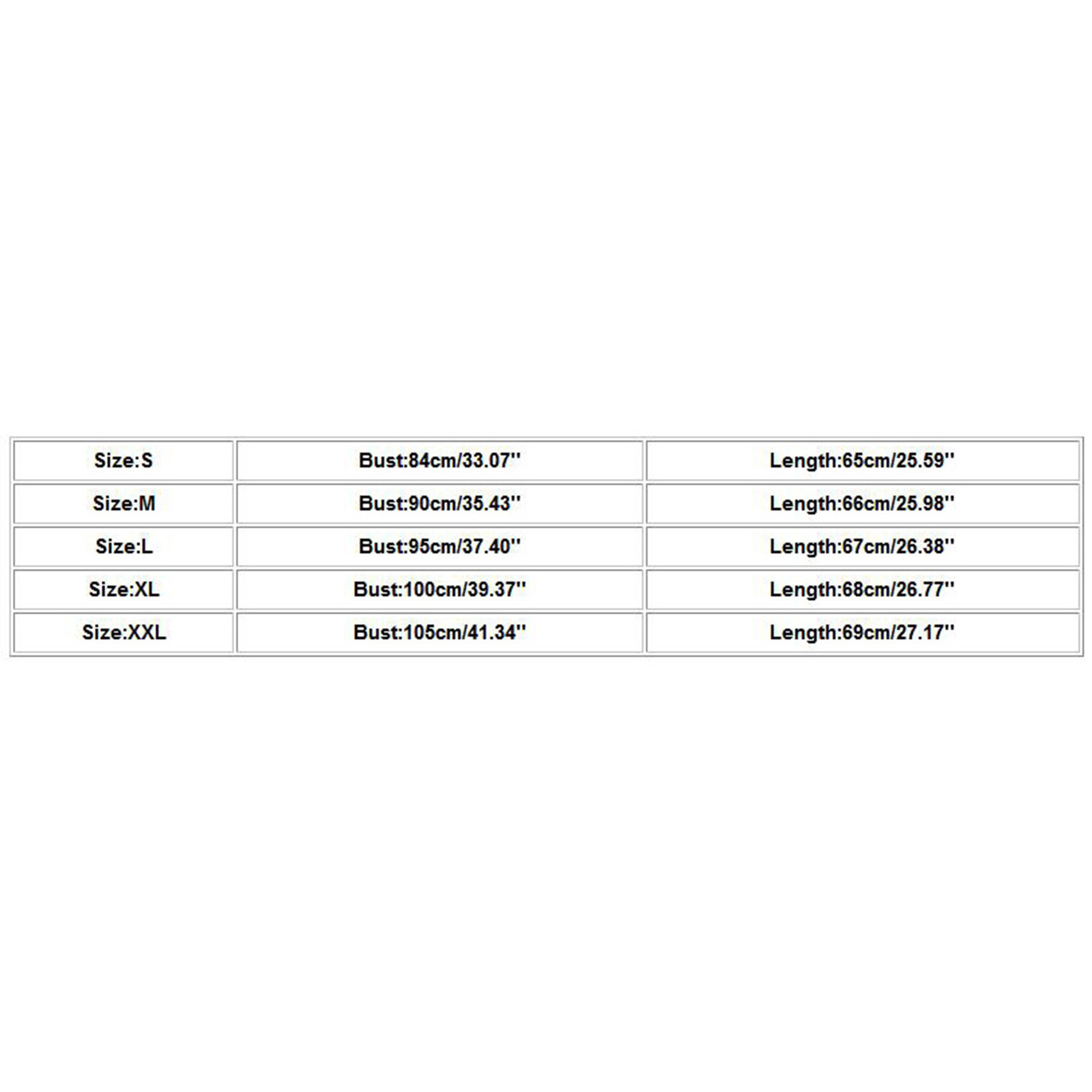Размеры Бюст Длина S 84 см/33,07 дюйма 65 см/25,59 дюйма М 90 см/35,43 дюйма 66 см/25,98 дюйма L 95 см/37,40 дюйма 67 см/26,38 дюйма XL 100 см/39,37 дюйма 68 см/26,77 дюйма XXL 105 см/41,34 дюйма 69 см/27,17 дюйма