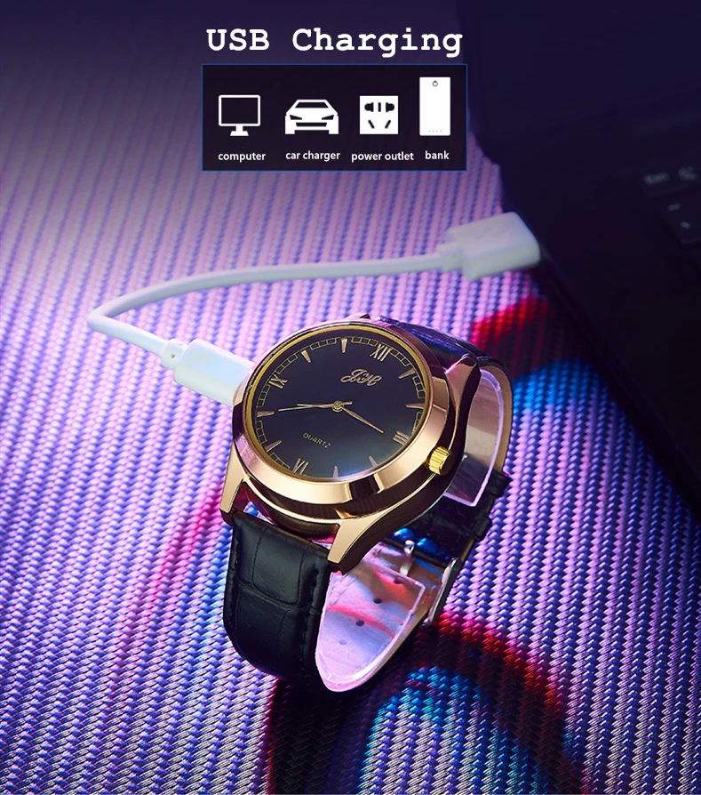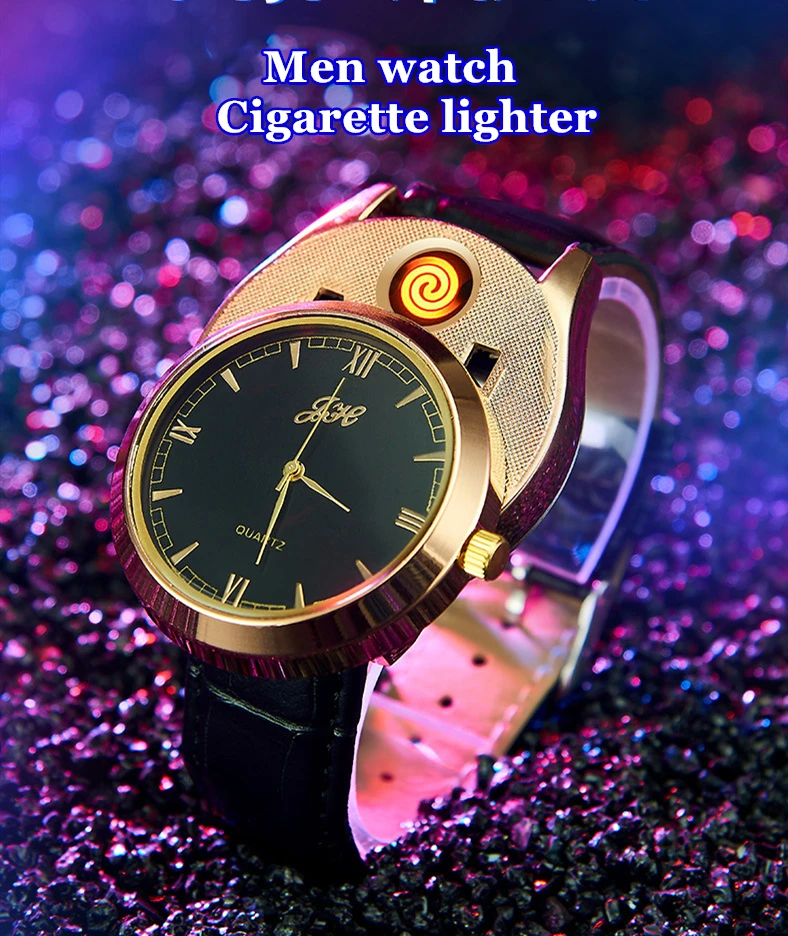 Мужские часы с зажигалкой, модные USB Rechargrable беспламенный кожаный ремешок, зажигалка, кварцевые часы, мужской подарок JH313