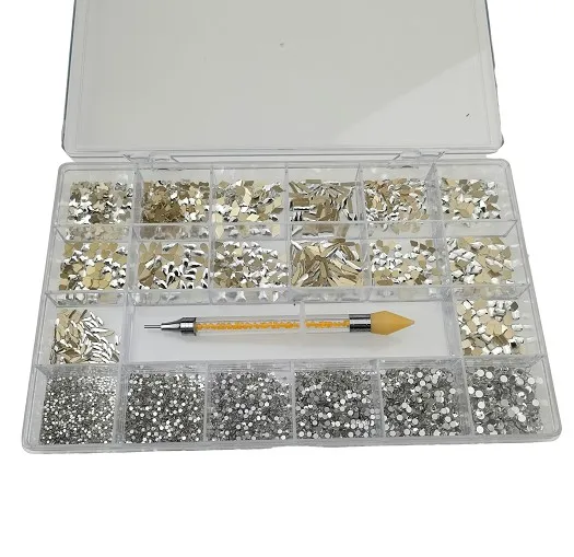 Стразы в комплекте: 1. 20 стилей стразы, каждый стиль 100 штук, всего 2000 штук в коробке 2. 1 многофункциональная двойная ручка для воска