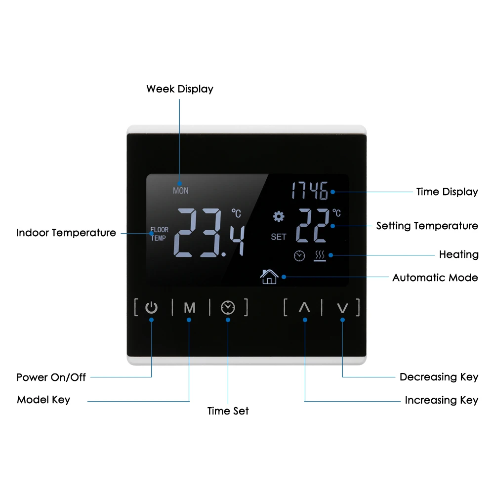 Этот цифровой термостат для напольного отопления использует усовершенствованный микрокомпьютерный чип управления и датчик высокой точности для контроля температуры электрических нагревательных устройств. Управляйте моторизованным шаровым клапаном, моторизованным клапаном, тепловым клапаном, электромагнитным клапаном, нагревателем, электрической нагревательной пленкой и электронагревательным углеродным кристаллом. В основном используется для подогрева пола и нагрева воды.