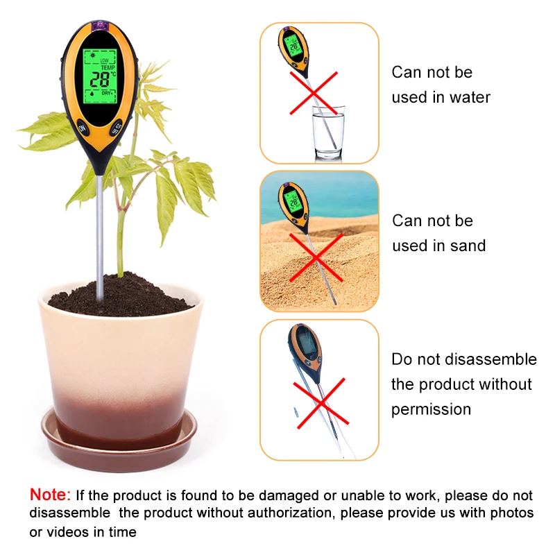 1. Можно ли откалибровать изделие? О: изделие нельзя откалибровать самостоятельно 2. Может ли продукт измерять жидкости? О: нет, продукт является тестером почвы и не может напрямую измерять воду. Замачивание пробника продукта в воде позволит воде попасть в продукт, разрушить электронные компоненты продукта и вызвать, что продукт не работает нормально. 3. Может ли продукт измерять песок и песчаную почву? О: нет, продукт не может измерять pH песка и песчаной почвы 4. Изделие нельзя использовать, могу ли я разобрать изделие самостоятельно? О: Нет, если есть проблемы с товаром, пожалуйста, не проверяйте товар самостоятельно. Пожалуйста, предоставьте нам фотографии и видео вовремя. После того, как мы рассмотрим, мы компенсируем Вам