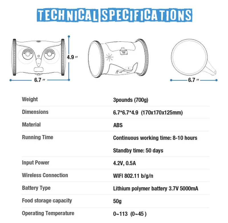 In fact,owl robot even lets you give your pet a treat whenever you feel it's the time to give her a snack ,whether to.the device allows you to give your pet up to 5 treats per charge.your pet will never have to suffer hunger when you are working late.
